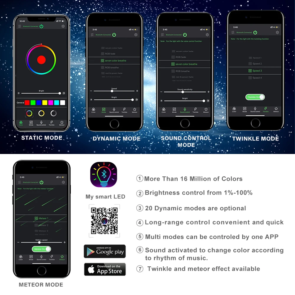 1. Пожалуйста, загрузите приложение «Мой умный светодиодный»2. Подключение устройства Bluetooth(1) Откройте Bluetooth мобильный телефон;(2) Включение лампы; Затем откройте приложение;(3) в это время приложение автоматически подключается к креплению на светильник Bluetooth.** Не подключайте Bluetooth к этому устройству вручную в настройках телефона.