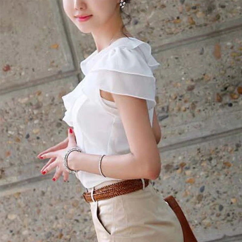 Блузка женская шифоновая однотонная с коротким рукавом и оборками