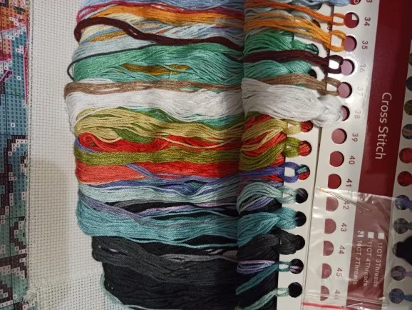 Набор понравился,оверлоченнная канва,две иголочки, 38 цветов ниток на органайзере,580 рублей. Картинка на наборе нечёткая и не яркая,буду надеяться что в отшиве будет не так тускло. Из неприятного бликующая схема на 4 листах с двух сторон. Доставка около месяца,с продавцом не общалась за ненадобностью