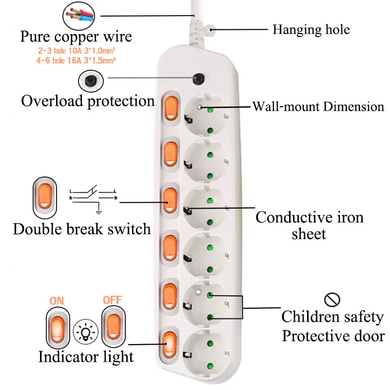 ЕС удлинитель розетки 1016A 250 В сетевой фильтр защита от перегрузки плата питания 4,8 мм штекер двойной выключатель розетка мощность полосы 2 контактный разъем переменного тока сетевой фильтр с usb
