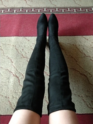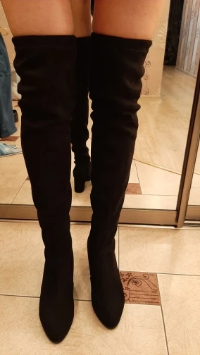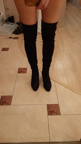 Очень боялась, что будет хлипкая подошва... Но всё хорошо! Высокие, с тугой резинкой сверху, от колена ладонь(я 172 ростом). Каблук мега удобный, выглядят норм.