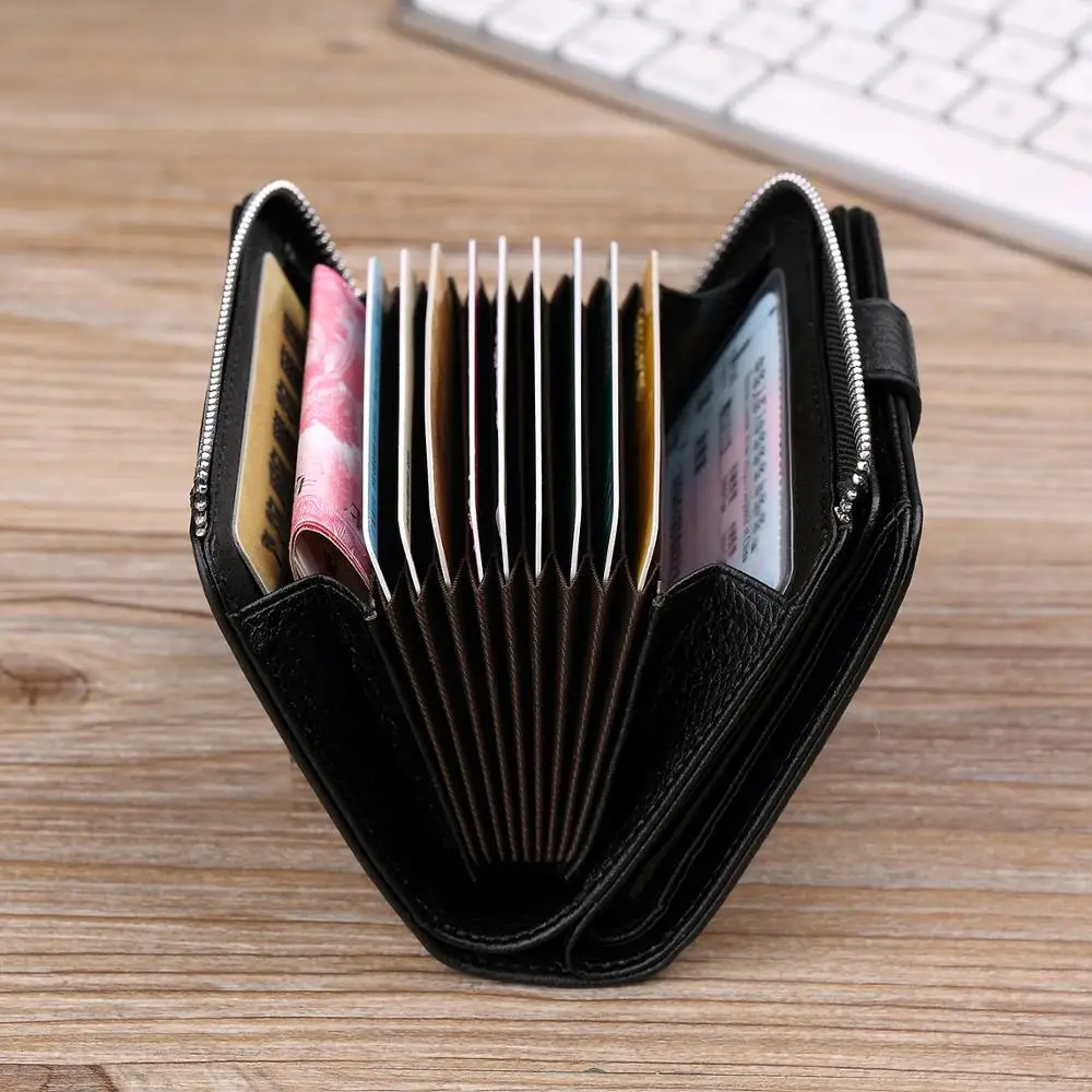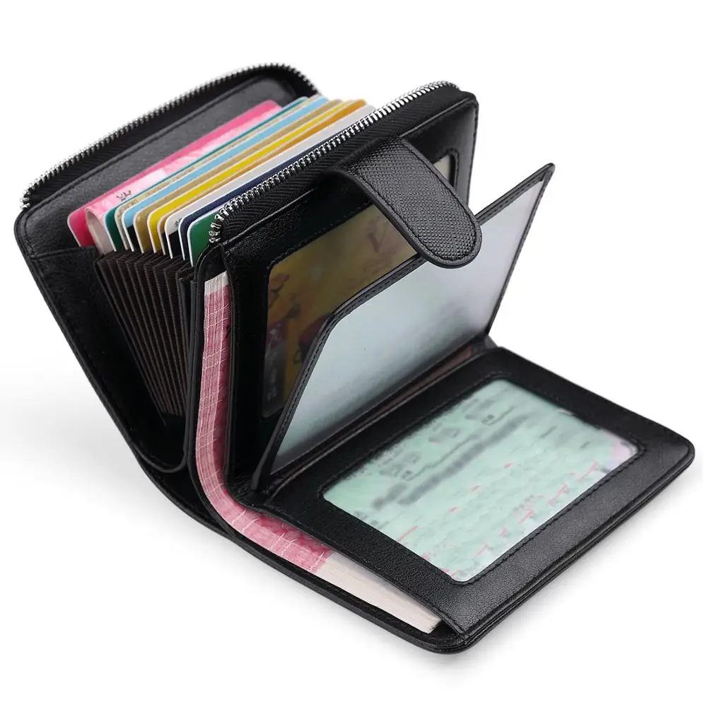 Эксклюзивный универсальный и многофункциональный дизайн:1 отделение для банкнот и 11 отделений для карт в стиле гармошки и 4 внутренних окна, которые сохраняют все ваши кредитные карты, банкноты, счета, разверните наличные деньги, изменения, водительские права, удостоверения личности, фитнес-карты, транспортная карта, визитки, фотографии и т. Д. Всегда на вашей стороне