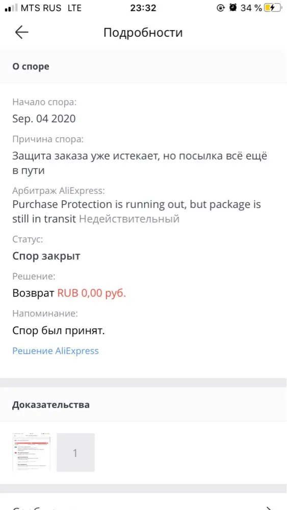 Я не доволен вашей службы поддержки, когда в споре надо было добавить материалы по спору я не мог добавить фото и после этого я хотел написать оператору в службу поддержки о том что посылка прибыла на место вручения, я не смог достучаться до живого человека мне постоянно отвечал робот. И я не согласен с решением спора, посылка находится на месте выдачи!