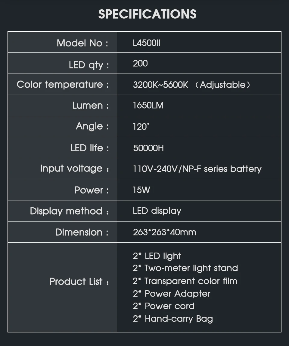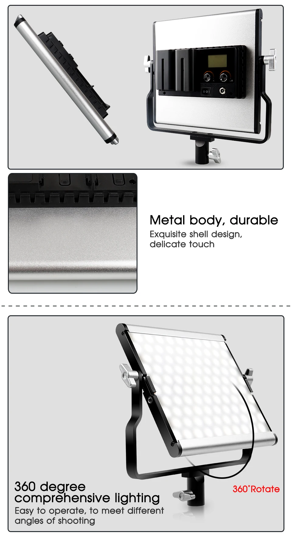 Отличный продукт и обслуживание! Он прибыл всего за 3 дня, в идеальных условиях. Светодиоды точно такие, как было заявлено. Сначала я думал, что это будет не так хорошо, как мягкая коробка, потому что она была меньше и дешевле. Но я оценил это абсолютно неправильно! Товар отличный! Штативы очень высокие, что потрясающе для того, что мне нужно! Также свет, обеспечиваемый светодиодными панелями, очень хороший, даже с одним из них. Я очень доволен!