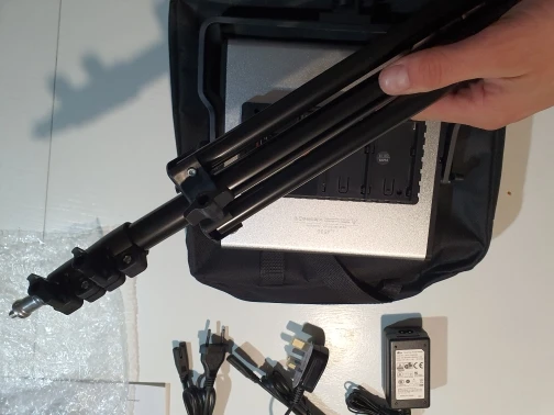 доставка мегабыстрая курьером до двери. Работает, но сделана в "лучших традициях Китая". Все крепления пластмассовые, штатив люфтит, если выдвинуть повыше, то качается. На улице, если ветер подует, то в лучшем случае будет качаться. Такие симпотичные на фото чемоданчики, на деле оказались дешёвыми авоськами. Не смотря на все недостатки, свои функции выполняет и меня устраивает, так как съёмки планируются только в помещении.
