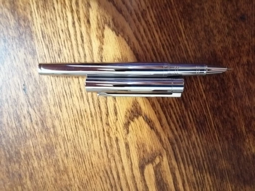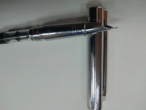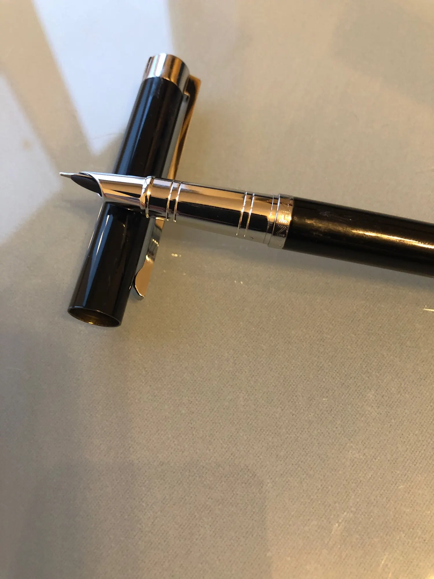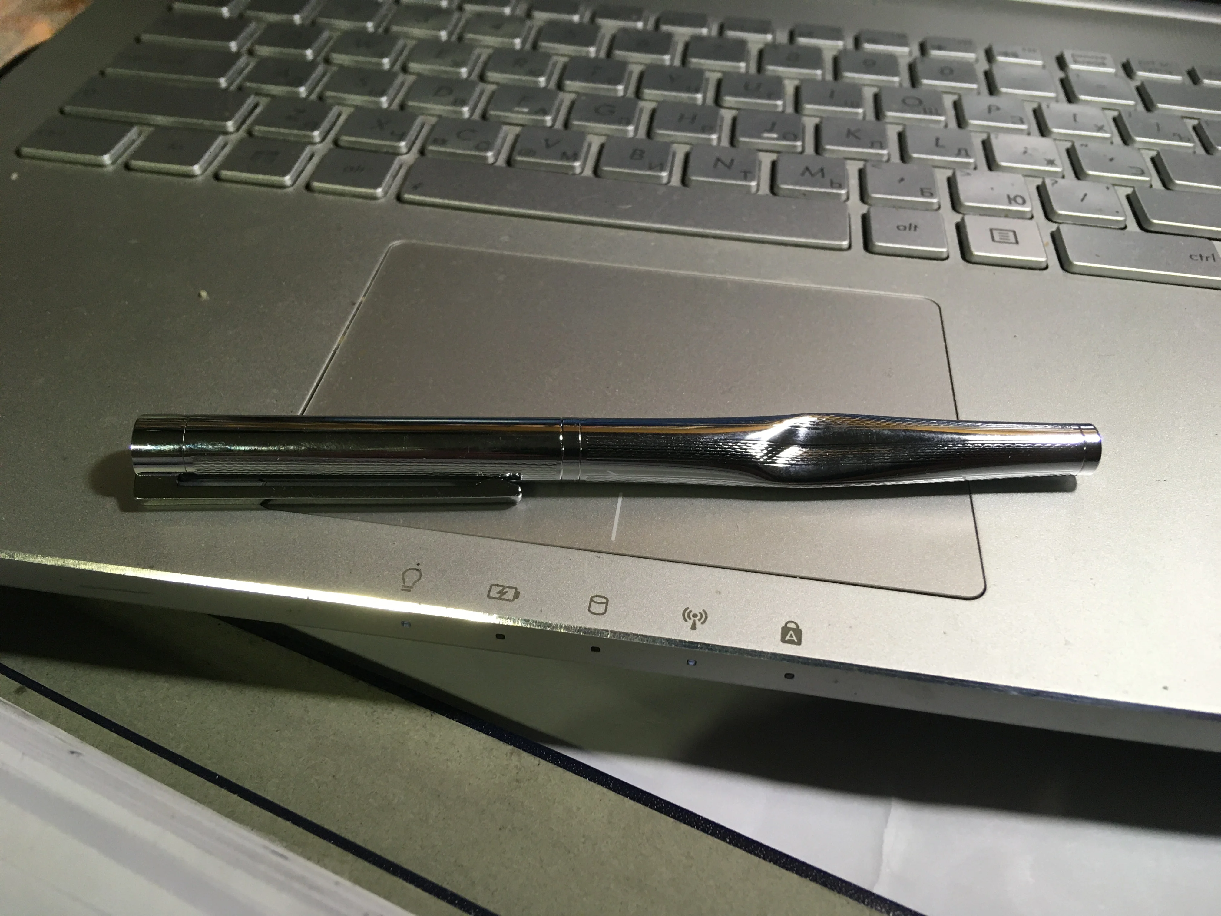 Красивая, аккуратная, тяжелая. Пишет хорошо, тонко, на быструю роспись не всегда хватает скорости подачи чернил. Требует точного положения пера относительно бумаги. В руке скользит. Развесовка не очень удачная. Учитывая стоимость, всё отлично.