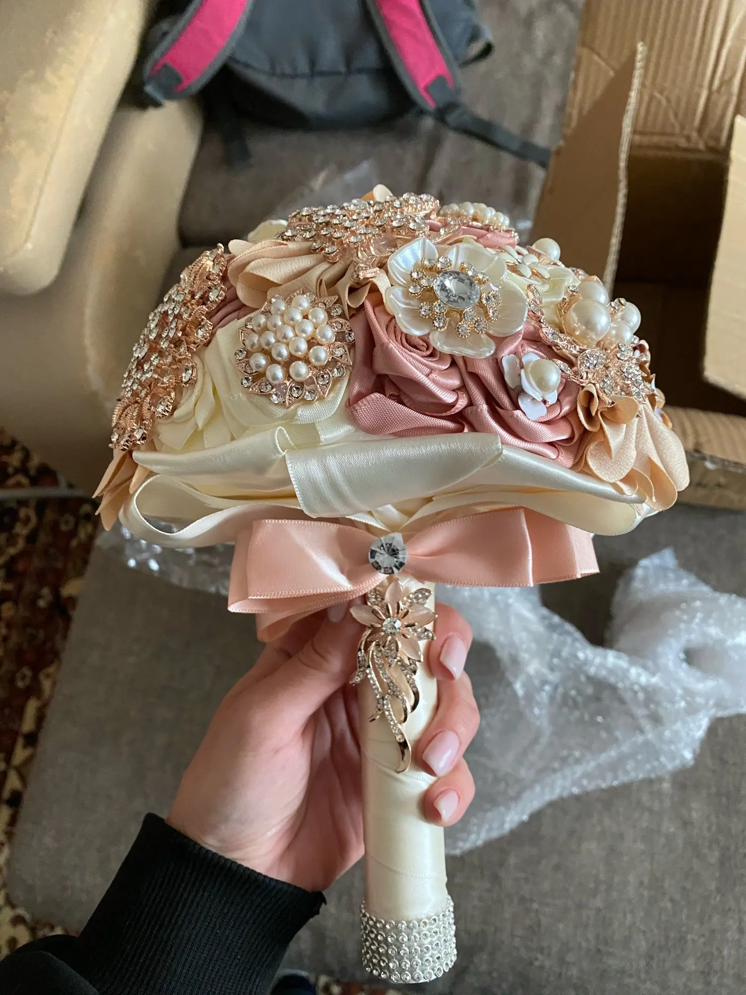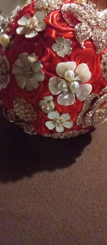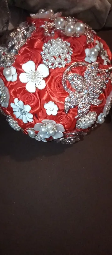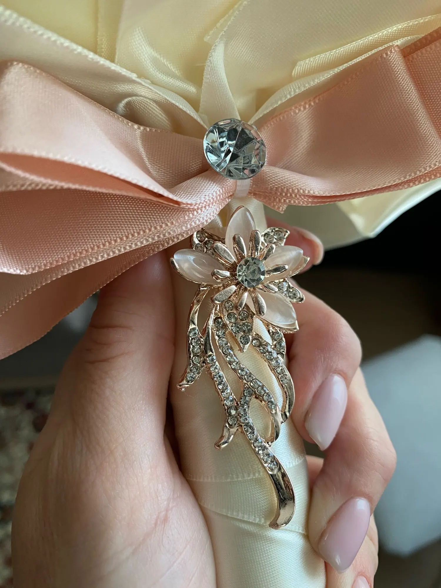 Я в восхищении! Доставка заняла 15 дней, коробка немного помята, но внутри есть подушки с воздухом. Букет целый, ровный, стразы все на месте. Броши имеют очень прочное крепление. Выглядит вживую намного лучше, чем на фото! Очень советую продавца и этот букет! В коробке ещё был пакетик с клеем и двумя камнями