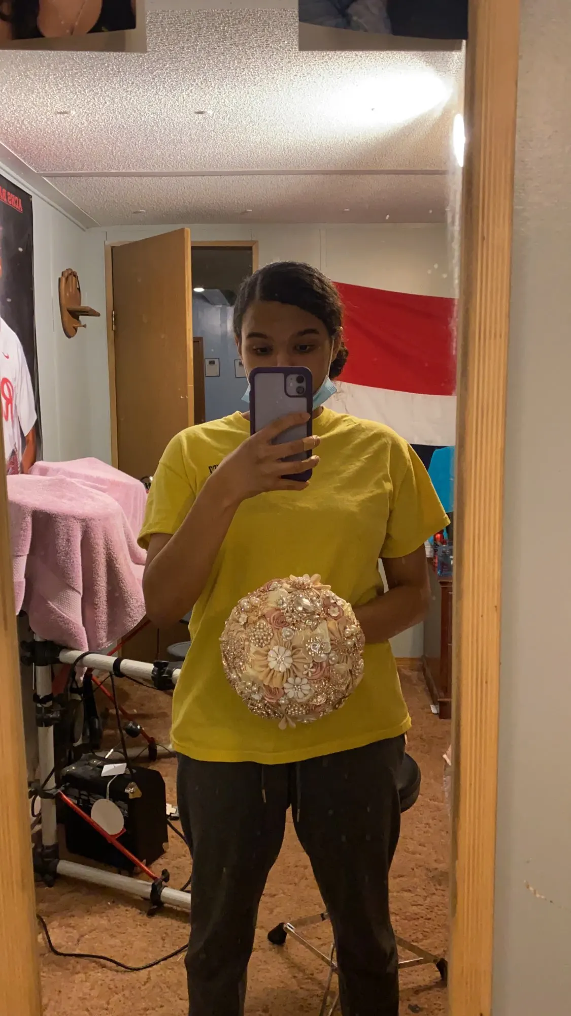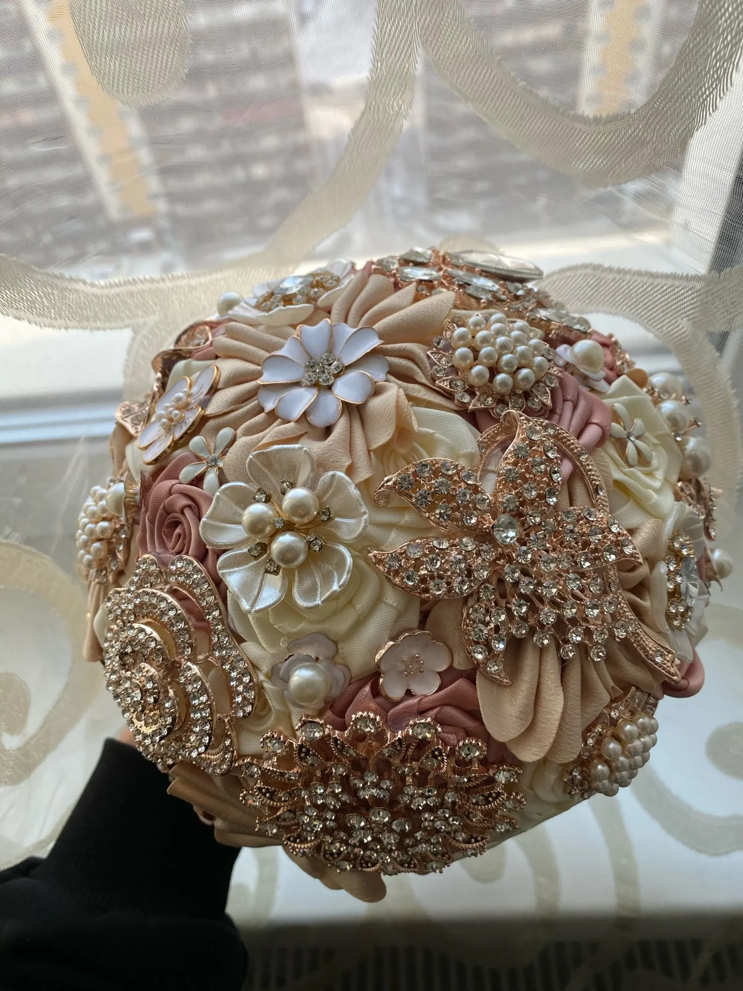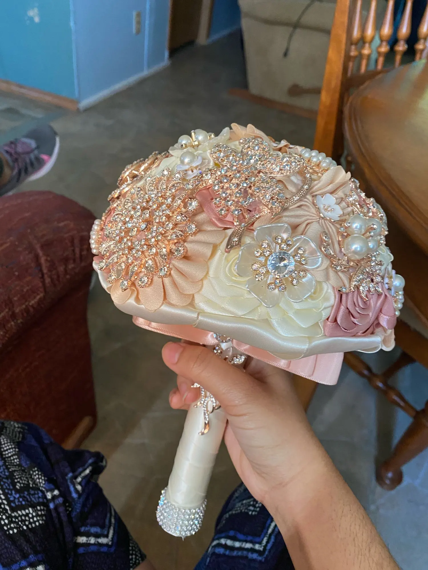 Я в восхищении! Доставка заняла 15 дней, коробка немного помята, но внутри есть подушки с воздухом. Букет целый, ровный, стразы все на месте. Броши имеют очень прочное крепление. Выглядит вживую намного лучше, чем на фото! Очень советую продавца и этот букет! В коробке ещё был пакетик с клеем и двумя камнями
