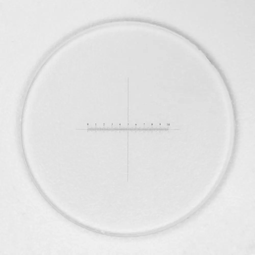 Диаметр: 17,8 мм, 19 мм, 19,8 мм, 20 мм, 21 мм, 22,5 мм, 23 мм, 24 мм, 25 мм, 26 мм, 27 ммМатериал: оптическое стеклоЛинейка DIV = 0,1 ммX = 10 ммКостюм микроскопа: Биологический микроскоп или стерео микроскоп