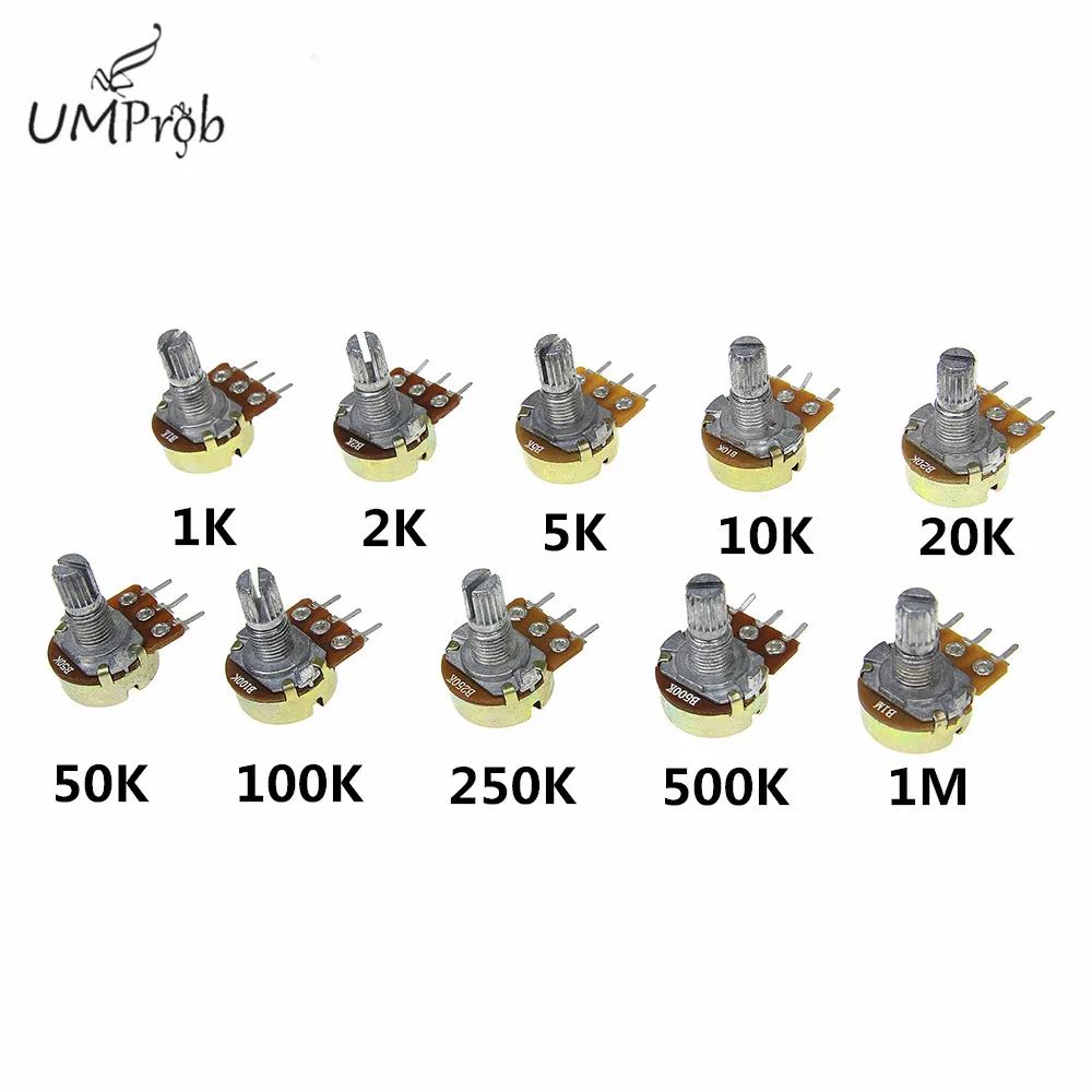 Линейный потенциометр WH148, 10 шт., B1K, B2K, B5K, B10K, B20K, B50K, B100K, B250K, B500K, B1M, вал 15 мм, с гайками, шайбы, 3pin, WH148