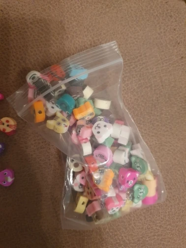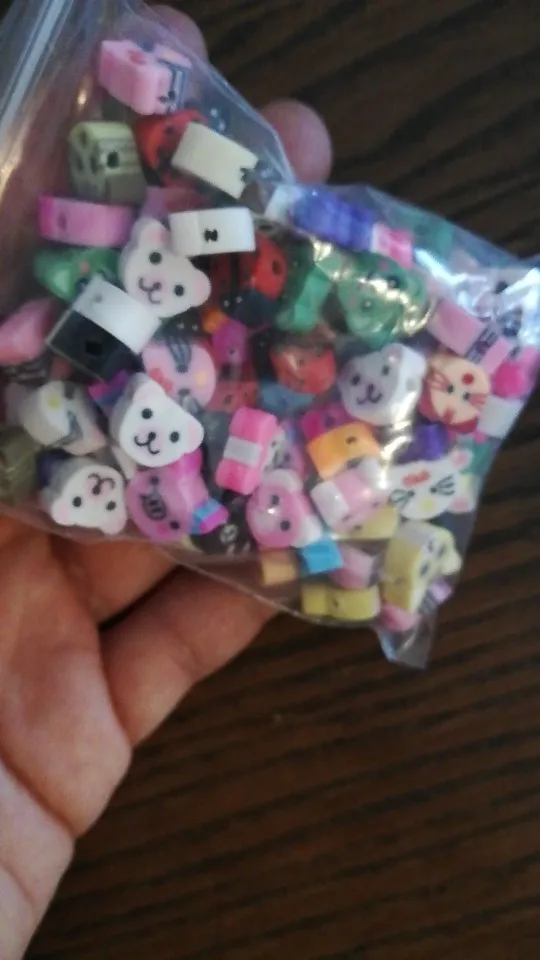 красивые маленькие бусины. пахнут какой-то пластмассой, но думаю это быстро выветрится. единственное что меня огорчает - на картинке изображено больше животных чем есть на самом деле (я не заметила жабок например, зато есть похожие зеленые медведи)