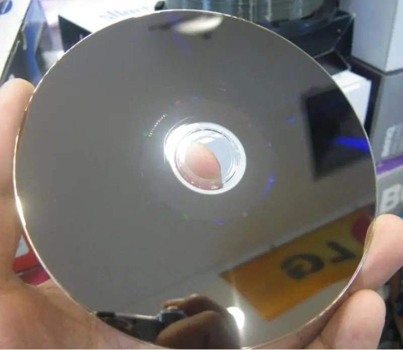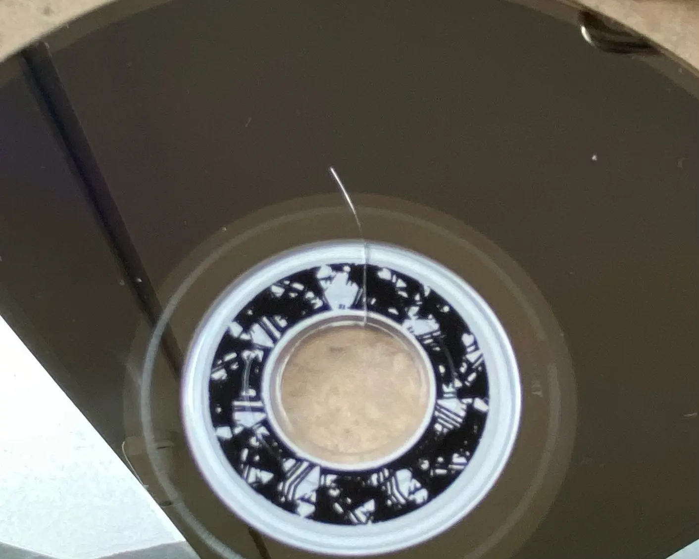 Диски предельно странные: на каждый диск наклеена бумажка, которая, видимо, и является печатным слоем. Печатать на таком и правда удобно, но чтобы каждый диск был проклеен… первый раз такое вижу… хотя диски определились как VERBAT-IMc/000, что как бы хорошо и соответствует производству данных блинов CMC (это легко проверить по данным Вербатима, там указан производитель болванок с этим идентификатором), но я никогда не видел Verbatim с наклейками, видимо какая-то подделка, а бумажки нужны для скрытия самого главного недостатка: ДИСКИ ТРЕСКАЮТСЯ в основании! Не разлетаются как раз благодаря печатному слою: бумажкам клеянным… Треснуло уже несколько дисков, фото просто последнего треснувшего, другие вообще на несколько больших трещин расходятся…