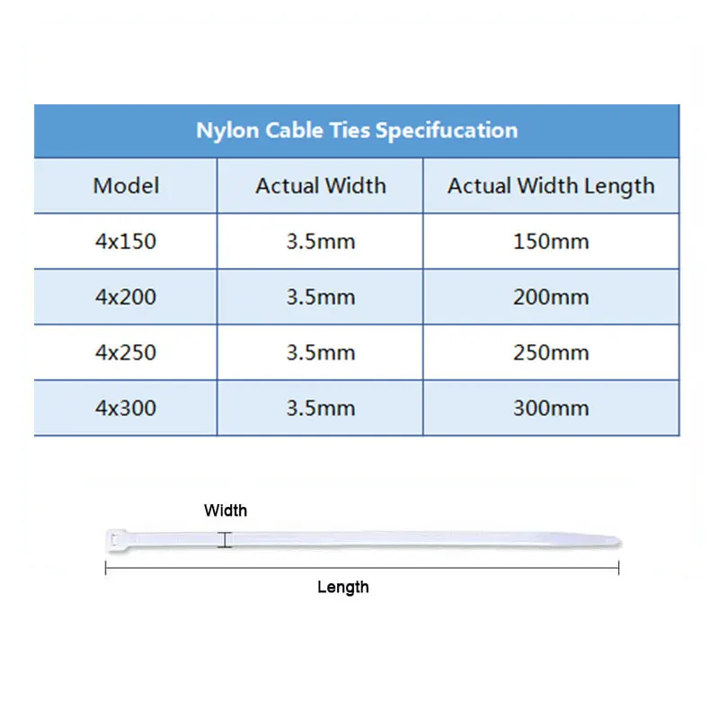 Название продукта:Для изготовления нейлоновых кабельных стяжек Модель:4x150 4x200 4x250 4x300 Цвет:Белый/черный Материал:Нейлон 66 Количество:100 шт./пакет Рабочая Температура:-35 ℃ до 85 ℃ Ширина & Длина:4X150: Ширина 3,5 мм, Длина 150 мм