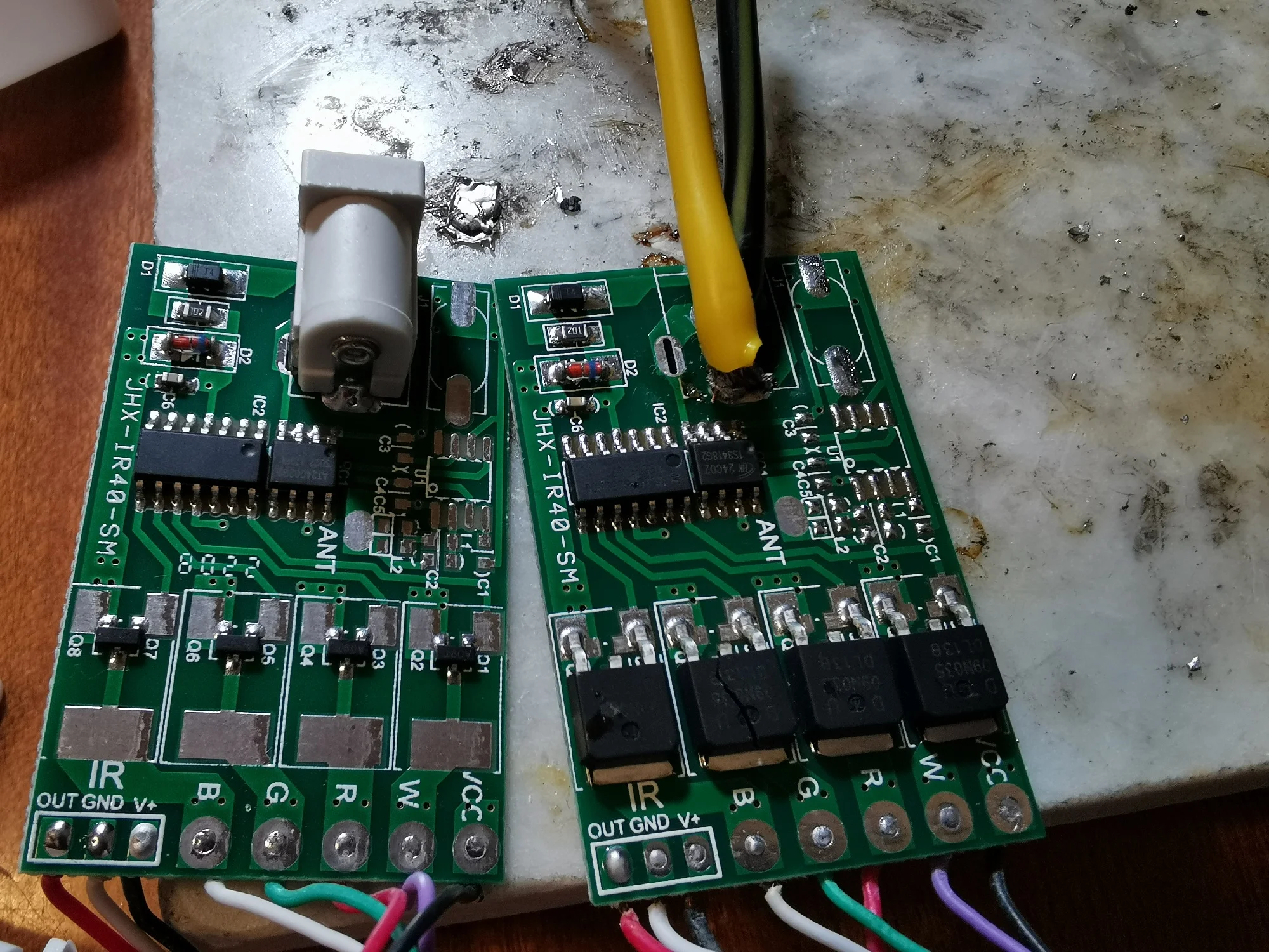 Хороший контроллер для организации освещения. Использовал для подсветки белыми 12v лампочками (3х0,62А на канал). Внешне 40key похожи, но элементная база разная. Плата этого контроллера на фото слева - силовые элементы очень маленькие. Но 1,86А долговременно держит, чуть больше 2А - горят. При диммировании на нескольких каналах одновременно появляется гудение.