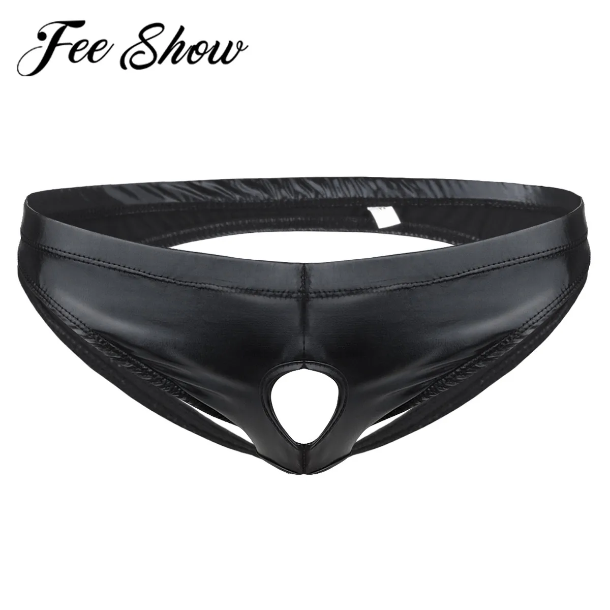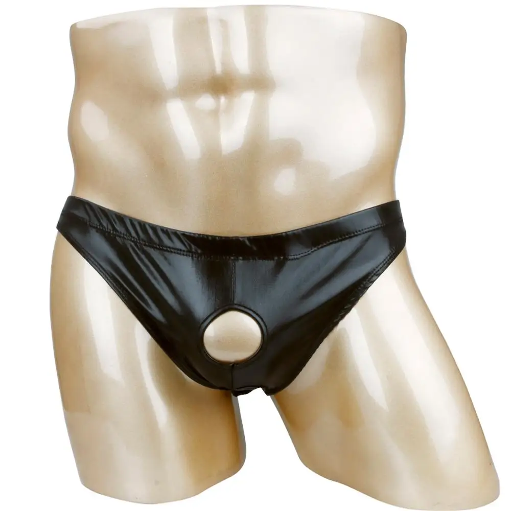 Сексуальные мужские блестящие трусы-бикини из лакированной кожи, нижнее белье для геев с двумя сексуальными отверстиями, M-XL