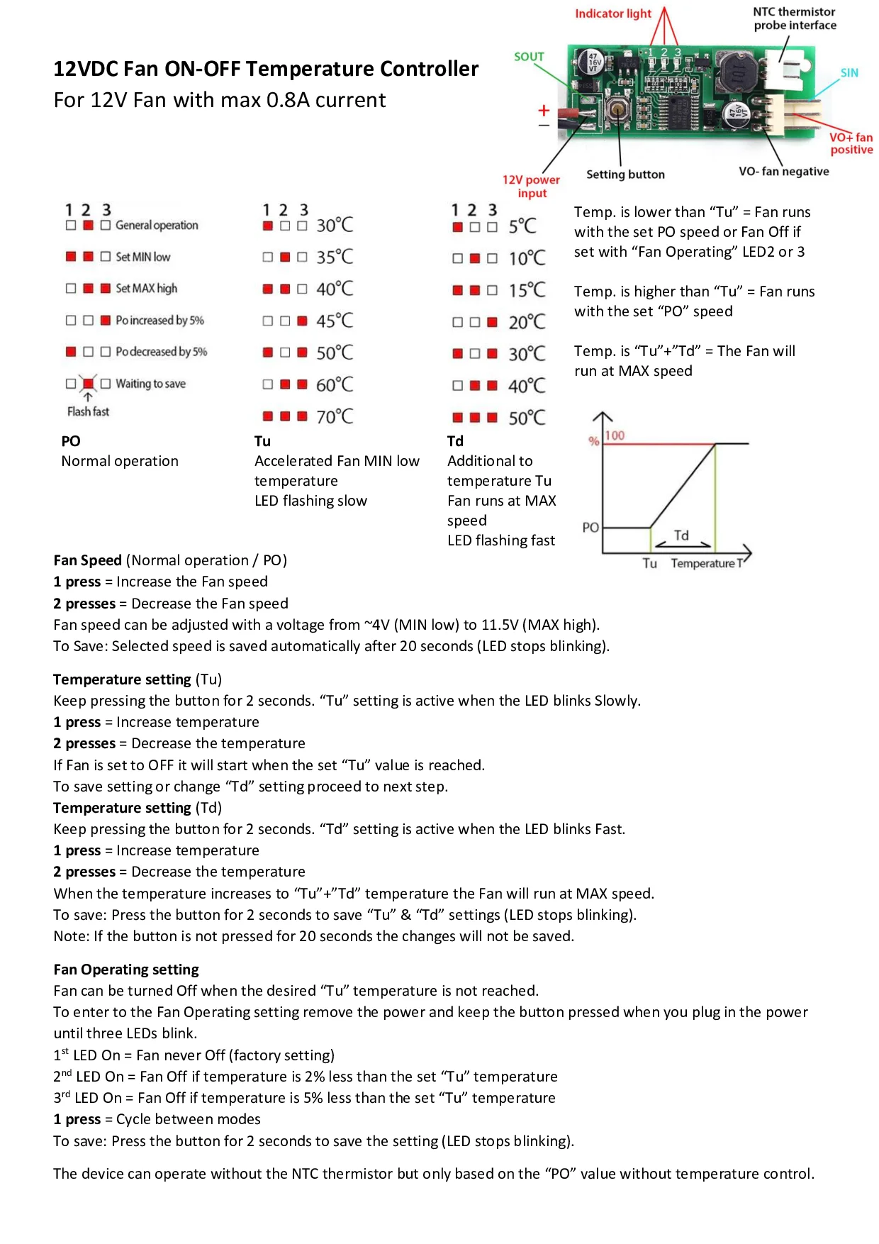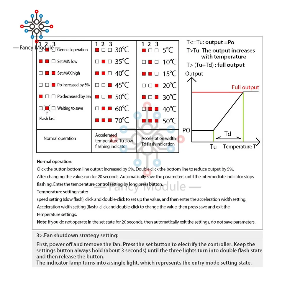 Доставка в течение 2 секунд. Хороший регулятор напряжения для вентилятора по температуре. Поддерживает 2-проводной вентилятор. Мое устройство застревает в режим отключения вентилятора (LED2), может быть ошибка. Сохраните прилагаемое изображение для инструкций по настройке контроллера вентилятора.