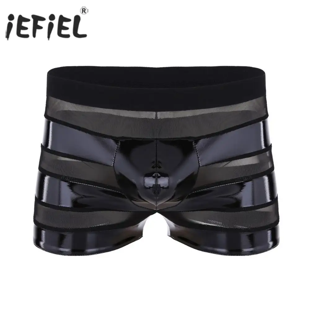 IEFiEL мужские трусы-боксеры с низкой посадкой, сетчатые шорты из искусственной кожи в стиле пэчворк, для геев