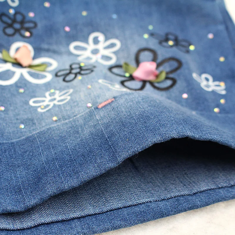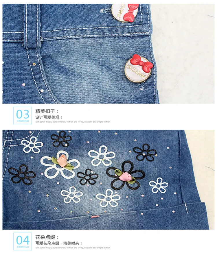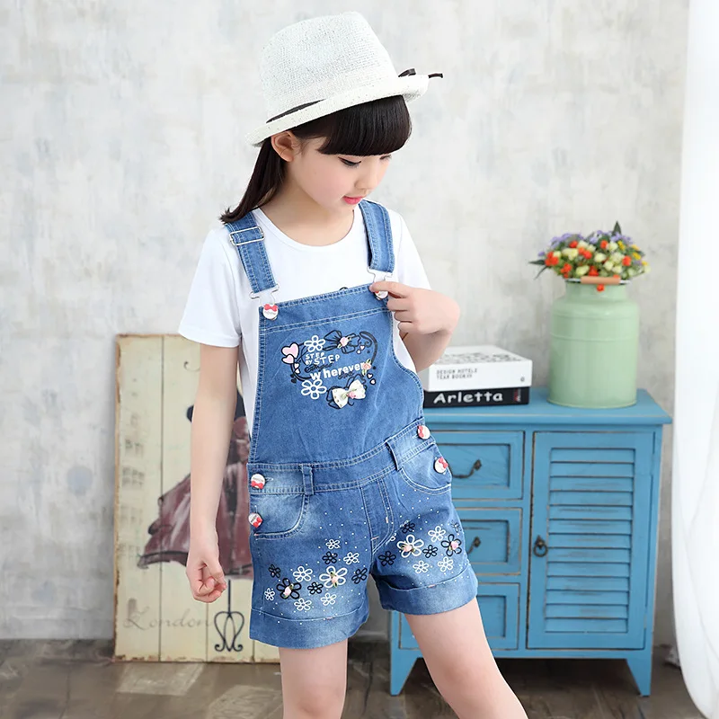 Новые комбинезоны для девочек, летние джинсы для девочек, одежда принцессы для девочек с бантом и цветочным узором, детские короткие джинсы, детская одежда