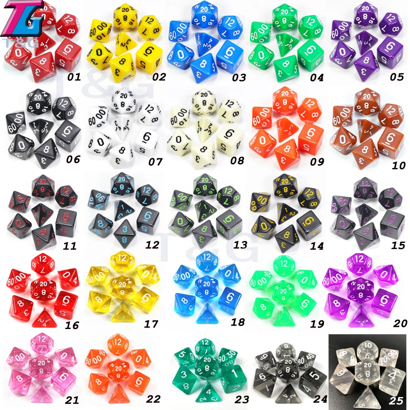 Оптовая продажа, набор многогранных кубиков 7 шт.лот D4,D6,D8,D10,D10 %,D12,D20, разноцветные аксессуары для настольной игры, DnD, RPG, 25 цветов