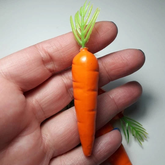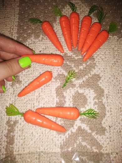 Морковочки из пластмассы. Аккуратные, ровненькие, без запаха. Плохо то, что не у каждой морковки есть зелёная травка. Брала два пакета: в одном все замечательно, а другой с браком ( не хватает зелёных веточек)!!! Вывод: по два пакета лучше не брать (видно продавец подумал "и так сойдёт) ОЧЕНЬ ЖАЛЬ!!!