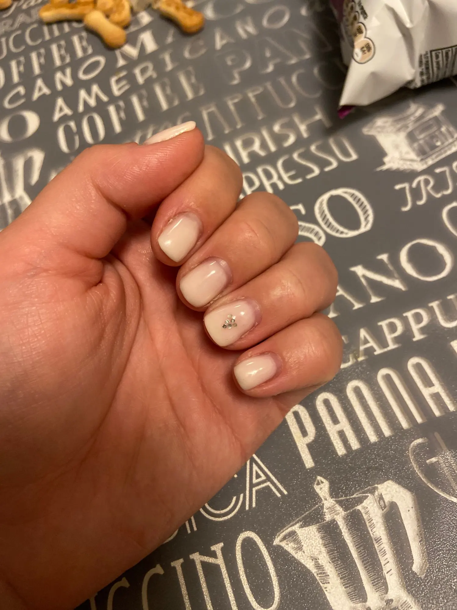 приятный гель, но цвет скорее не молочный а прозрачный с блестками, наносится комфортно, выравниваеться быстро