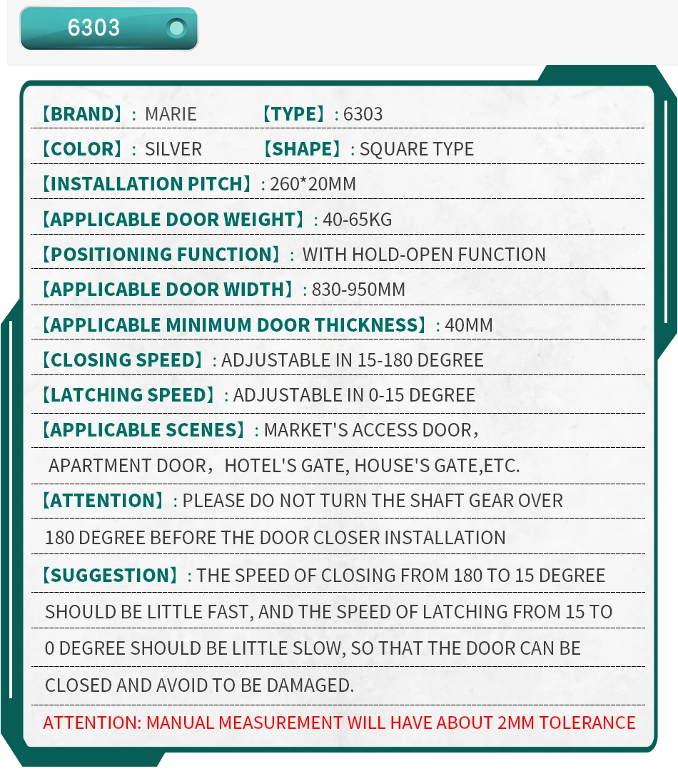 【Suggestion】:Скорость закрытия от 180 до 15 градусов должна быть немного быстрой, а скорость фиксации от 15 до 0 градусов должна быть немного медленной, так что дверь может быть закрыта и избежать повреждения.