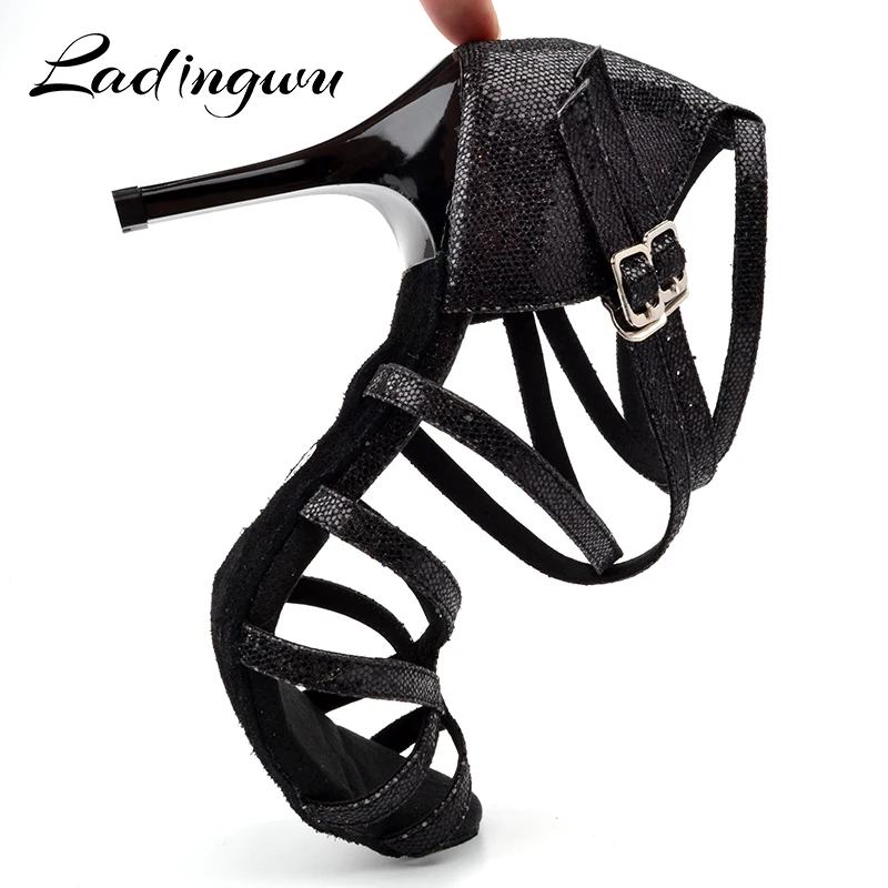 Женские туфли для латиноамериканских танцев Ladingwu, черные блестящие туфли, танцевальные сандалии для латинских женщин на каблуке 8,5 см
