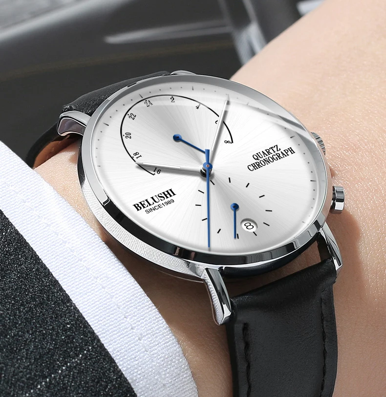 BELUSHI мужские водонепроницаемые часы с кожаным ремешком тонкие кв...