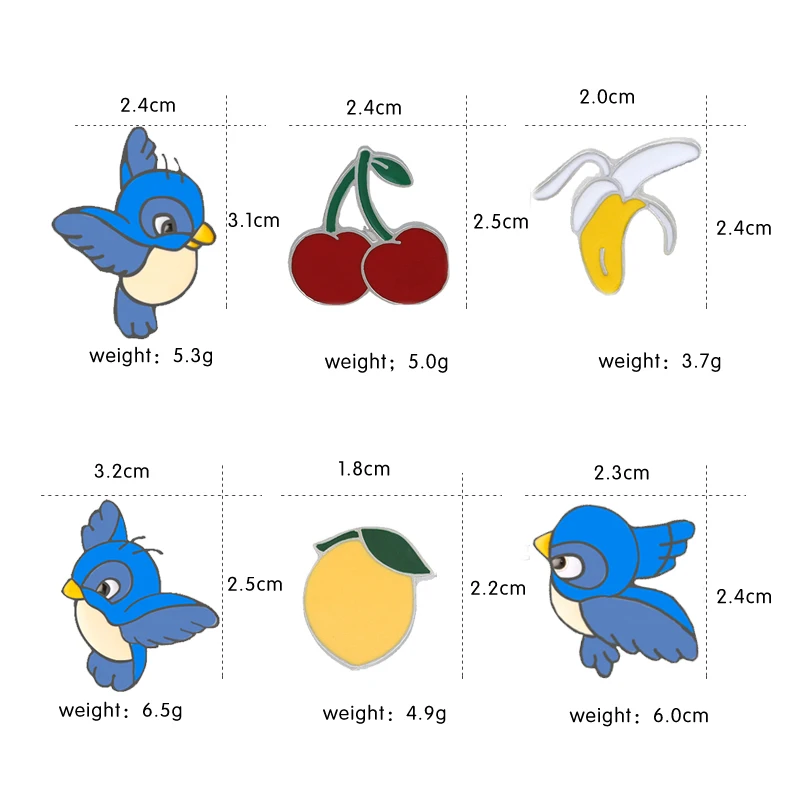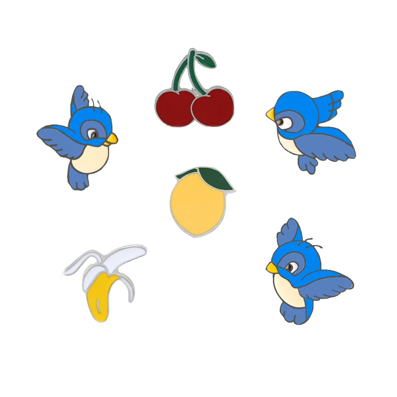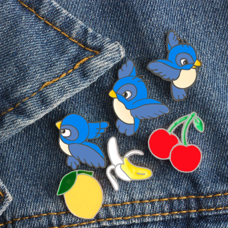 Симпатичная брошь в виде синих птиц, мультяшных фруктов, банана, вишни, персика, эмалированная заколка, женские куртки, нагрудные заколки, шляпа, Детская сумка, металлические бейджи, украшения