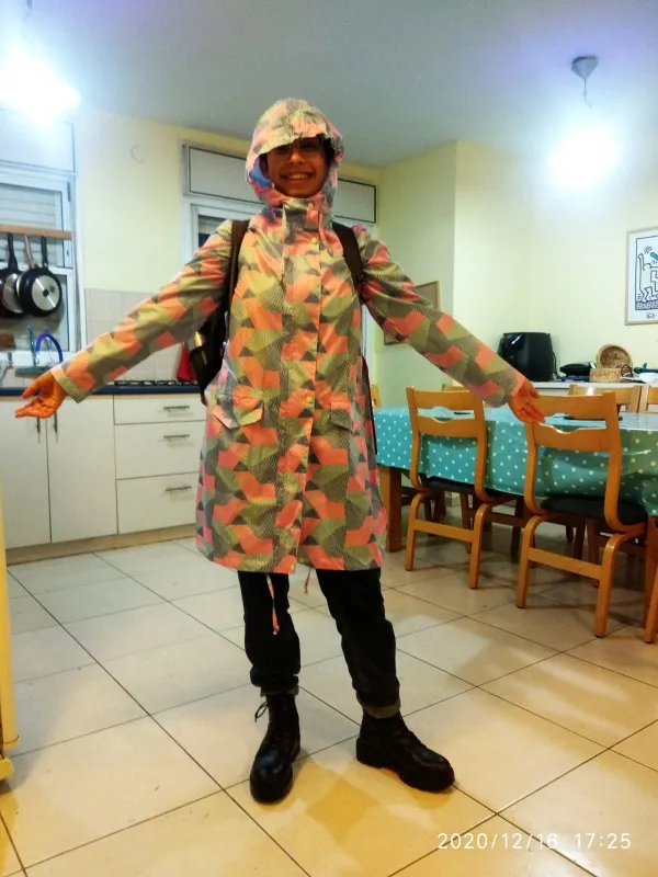 Очень качественный и удобный, как настоящий плащ. Надеваю сверху на теплые вещи или куртку, если холодно