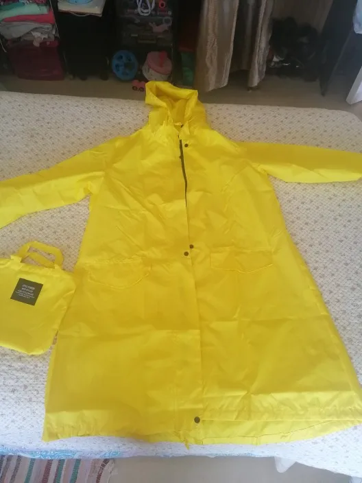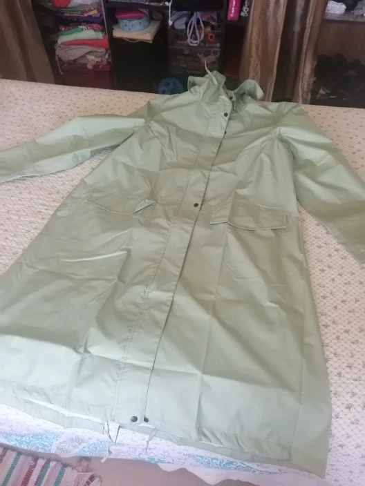 Товар пришёл быстро, трек номер отслеживался. Качество отличное, имеет молнию чёрного цвета, кнопочки белые, карманы есть и мини сумка для хранения!!!))) Я ношу 42 размер _подошёл плащ и даже на куртку можно будет одеть...