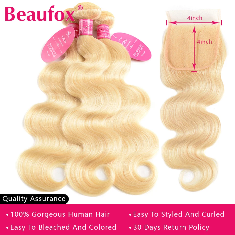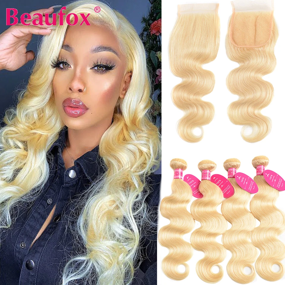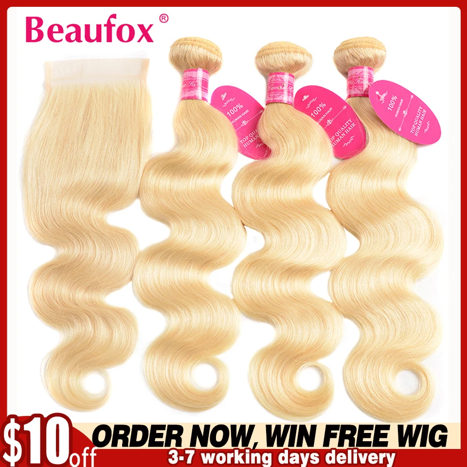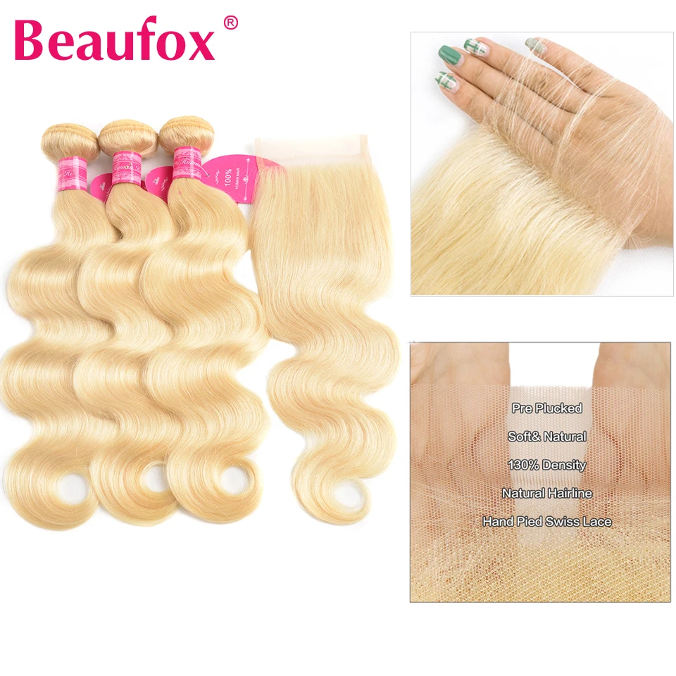 Beaufox 613 блонд пряди с закрытием бразильские объемные волны 3 пряди с закрытием светлые человеческие волосы пряди с закрытием Remy