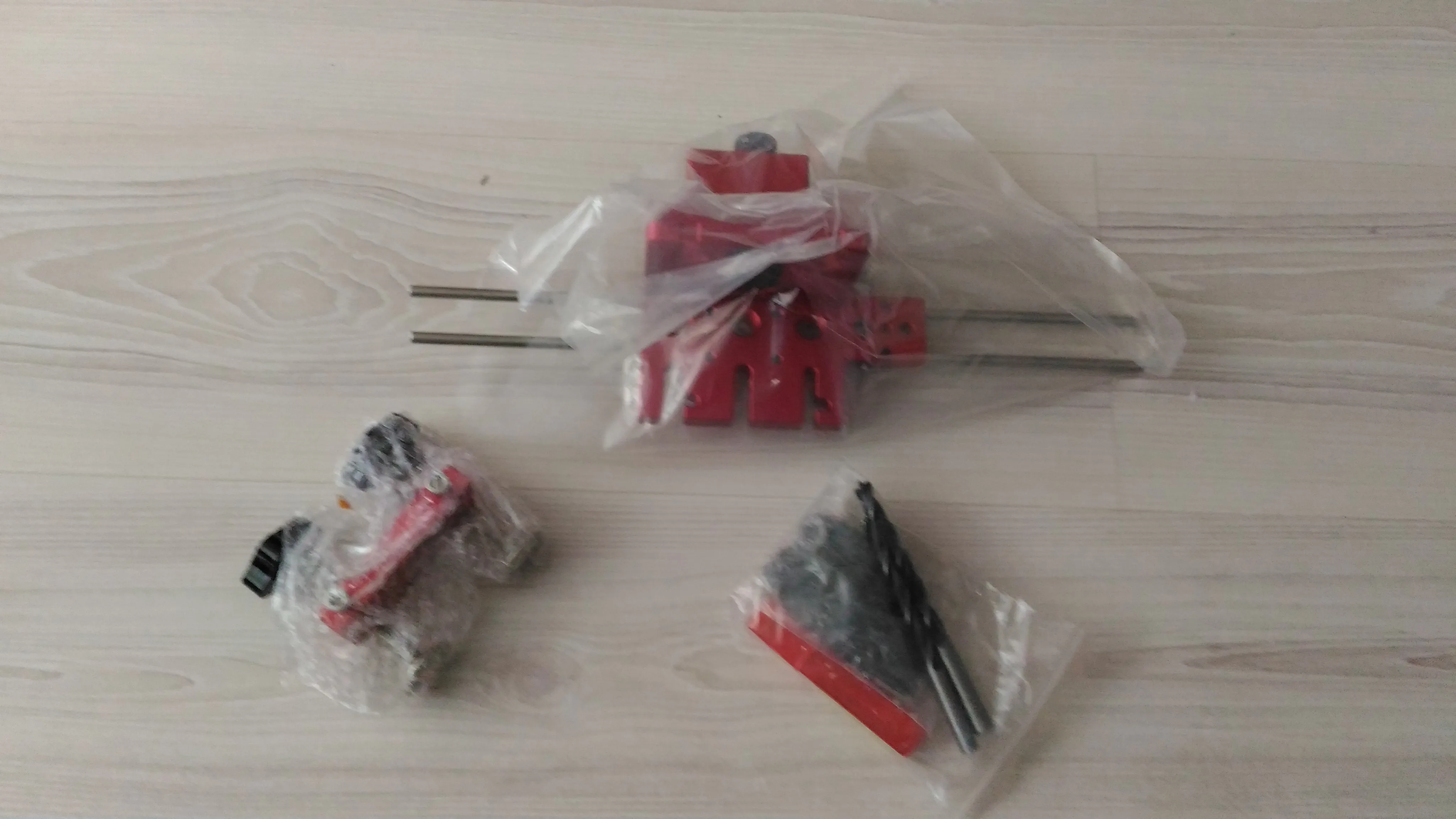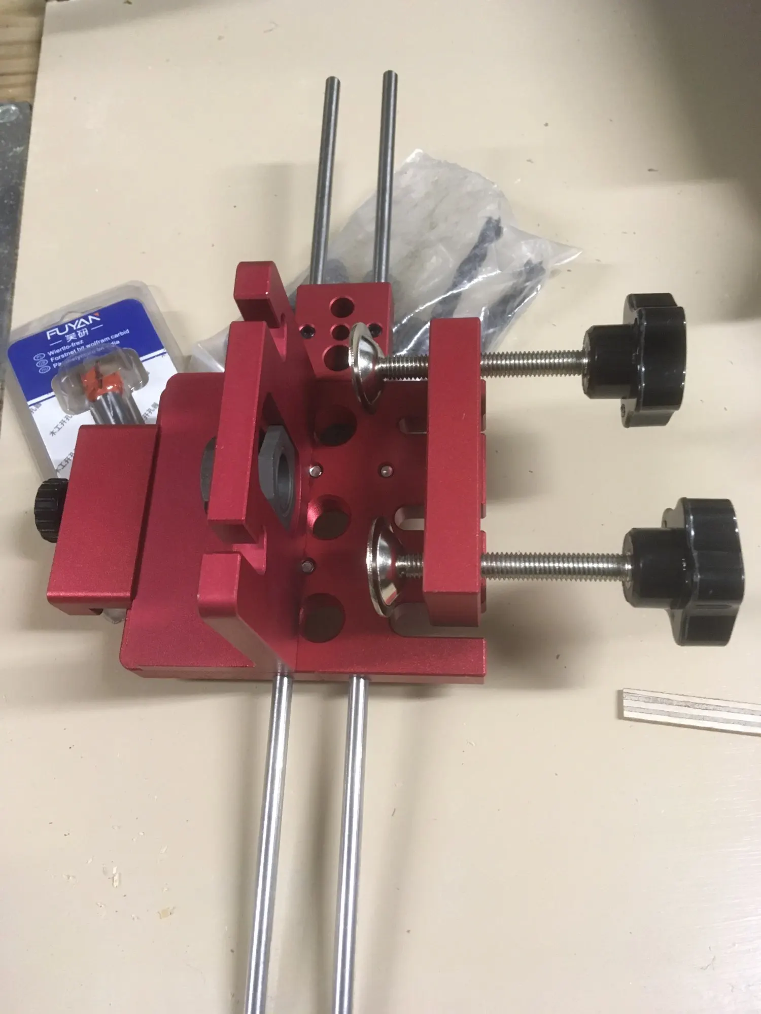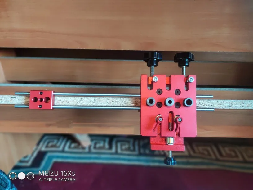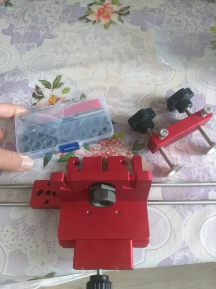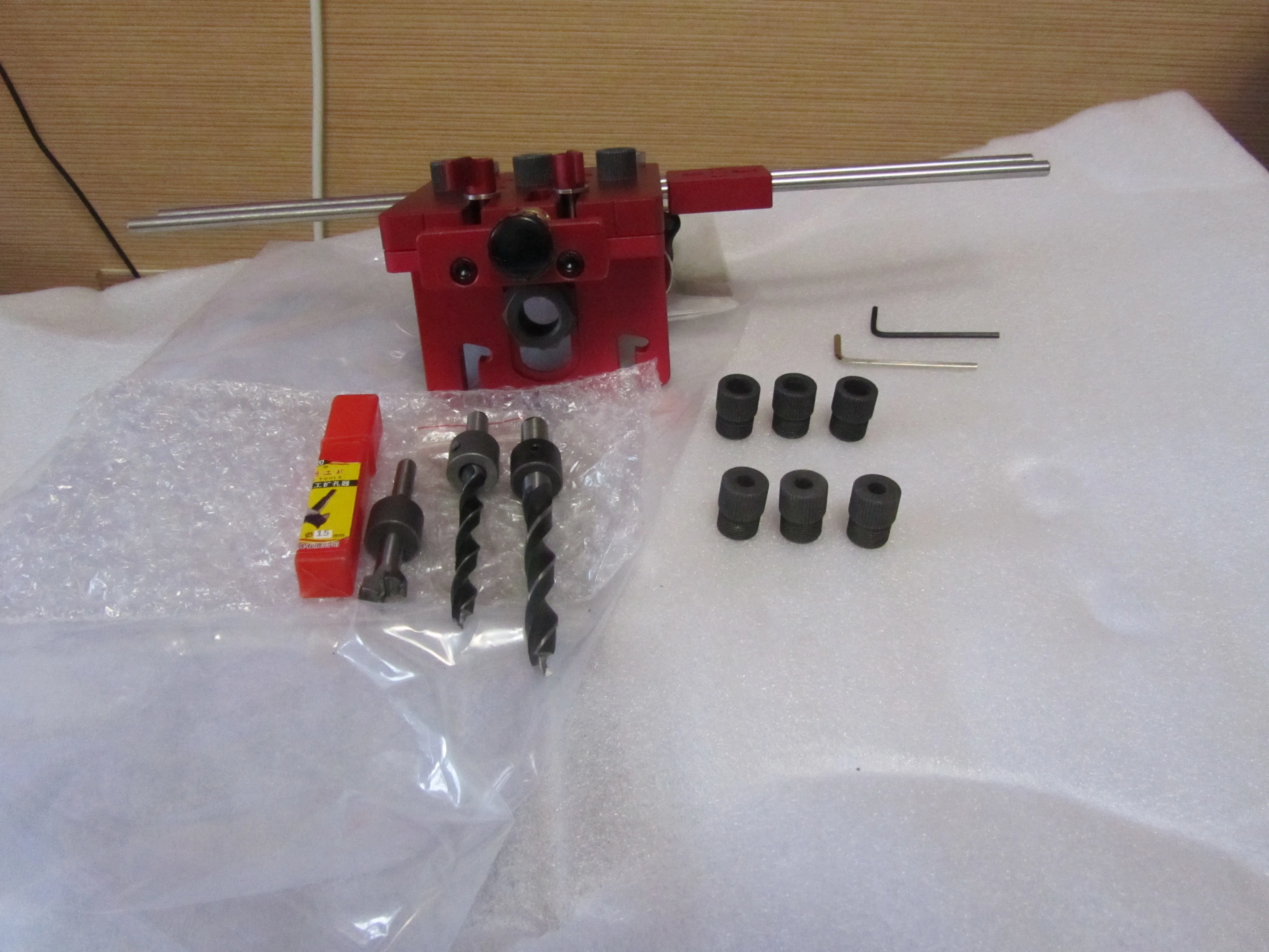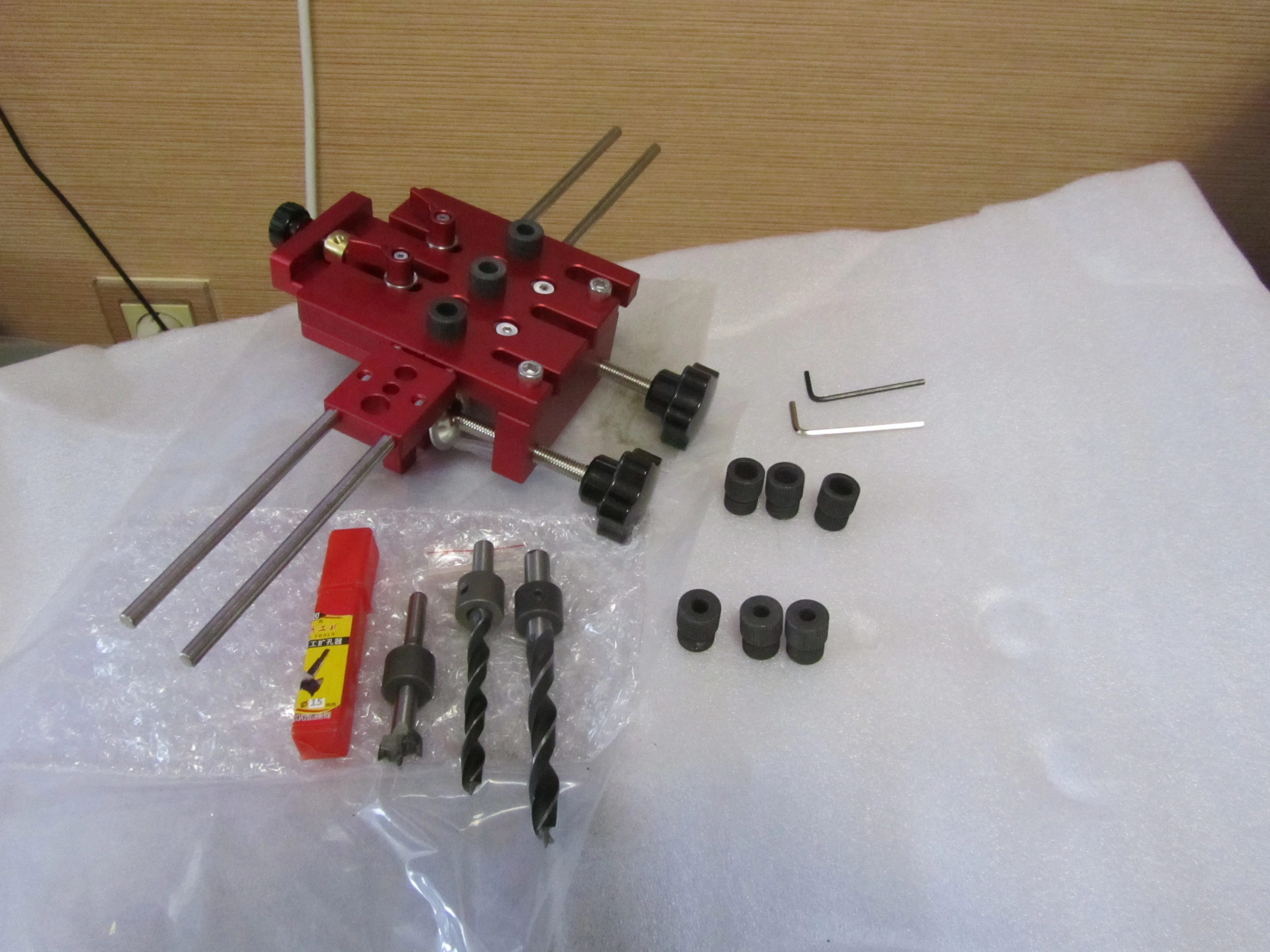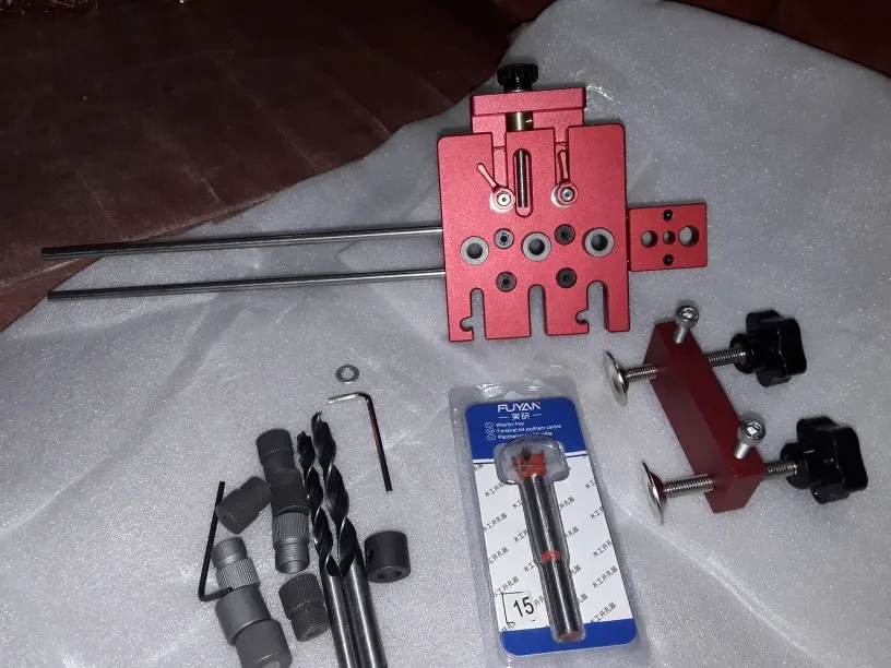 В Днепр заказ пришел за 24 дня . Само изделие создаёт приятное впечатление . Сверла низкого качества , особенно заточка . Ограничители свёрел с зазором 0,2-0,3 мм . Направляющие свёрел с зазором 0,5 мм . Шейка фрезы 15мм составляет 8мм , но ограничитель к нему с диаметром 9мм ( будем общаться с продавцом ). Гайки направляющей втулки имеют насечку на гране , для позиционирования по шкале , но её плохо видно , придется подкрасить белой краской . Длина направляющих стержней 350мм (d=6мм) . В наборе шестигранные ключи на 2.5 и 3 мм , надо ещё на 2 и 5 мм и ключ рожковой на 24 .