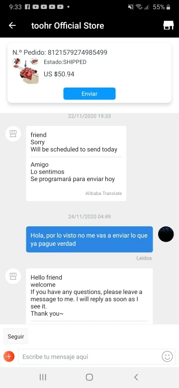 Товар имеет производственный дефект, и решение заключается в том, что вы платите за обратную доставку. Механизация одной из нитей не является правильной, и невозможно исправить руководство, потому что я должен оплатить пересылку, если то, что я получил, является дефектным? Другим решением является возврат половины суммы и то, что у меня есть дефектный продукт, мне пришлось принять этот вариант, потому что стоимость доставки в тот или иной товар намного дороже, чем Alliexpres. Я не рекомендую покупать товары в этом магазине, и alliexpres не несет ответственности за предполагаемое качество продукции/более высокую цену, чем настоящие проблемы. Очень плохой опыт.