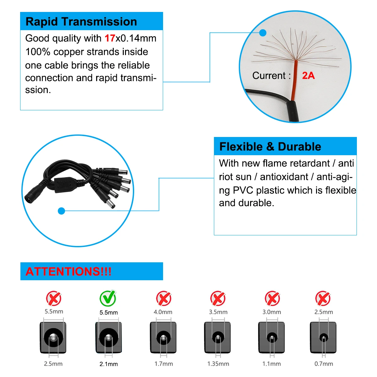 Кабель питания для светодиодных лент, 5,5 мм, 2,1 мм, от 1 до 234568, 5 В, 12 В