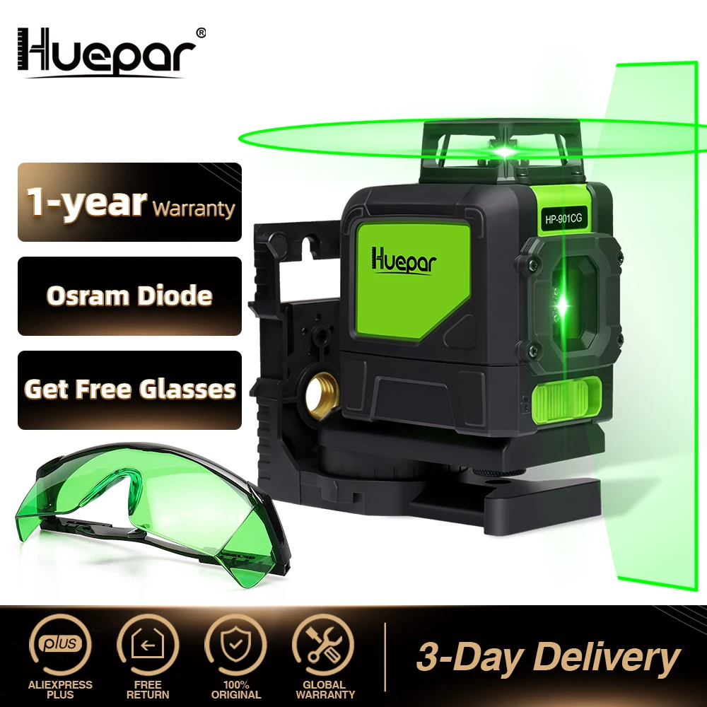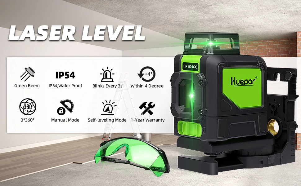Лазерный уровень Huepar, нивелир с зеленым лучом, ручной самовыравнивающийся импульсный режим на 360 , с оправой и комплектом очков