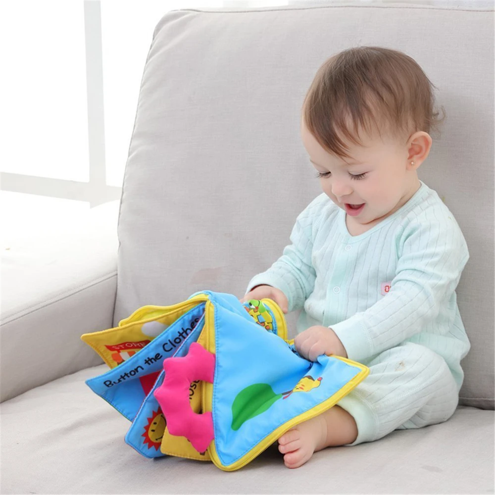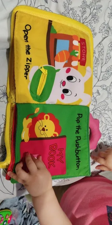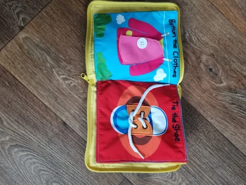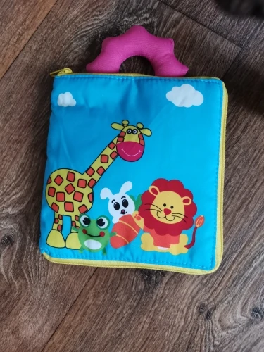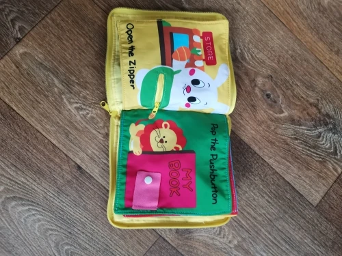 отличная книга для малышей, липучки, молния, пуговица,кнопка, домик и рыбки на липучках, стоит своих денег. Сама книга на молнии, сверху есть ручка, можно прикрепить к коляске. Фото после стирки, не полиняла, не отклеилась.