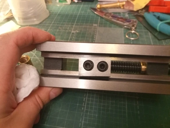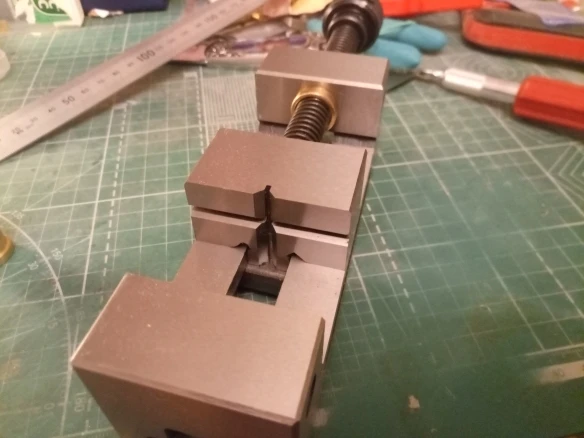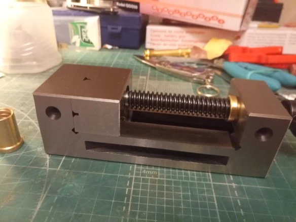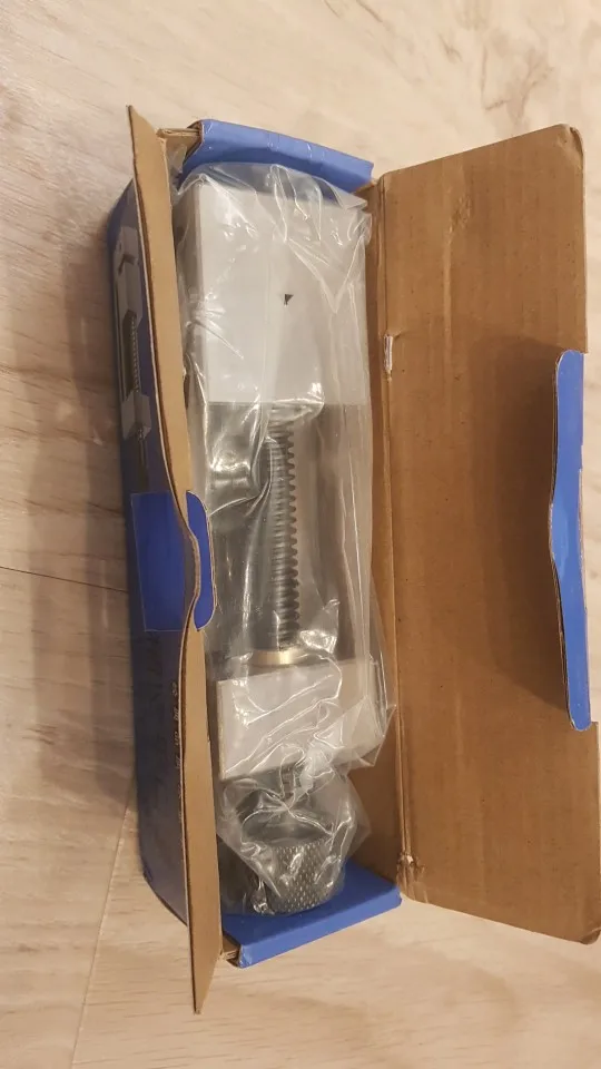 снизу прижимная планка прикреплена криво, но на работу тисков это сильно не влияет. запаковано в запаянный полиэтиленовый пакет. винт не очищен как следует, в комплекте была запасная латунная гайка для ходового винта - спасибо продавцу. подвижная губка чуточку меньше неподвижной губки - думаю, это для её подвижности при закреплении тисков на боку. в целом вещь внушает доверие.