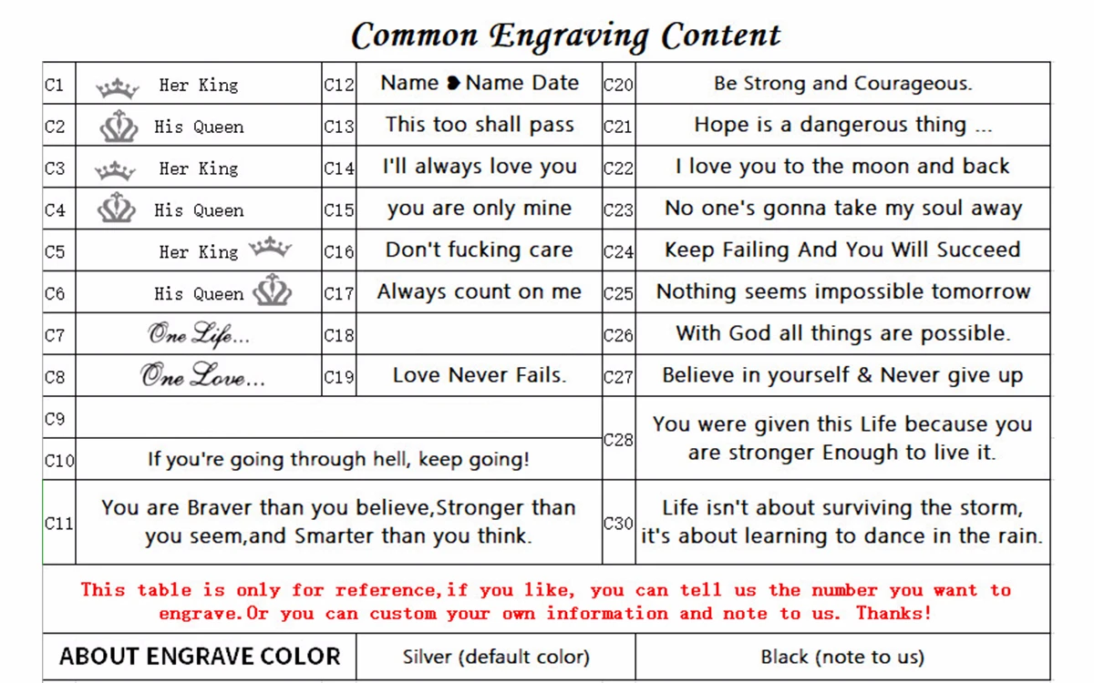 8. Как отметить текст и изображение?Укажите номер изображения внутри (). Например: черный шрифт 50, гравировка: Lucy (165) forever.Ваше собственное изображение, пожалуйста, отправьте вложение в сообщение или отправьте по электронной почте: smt88 @ sfstteljewelry