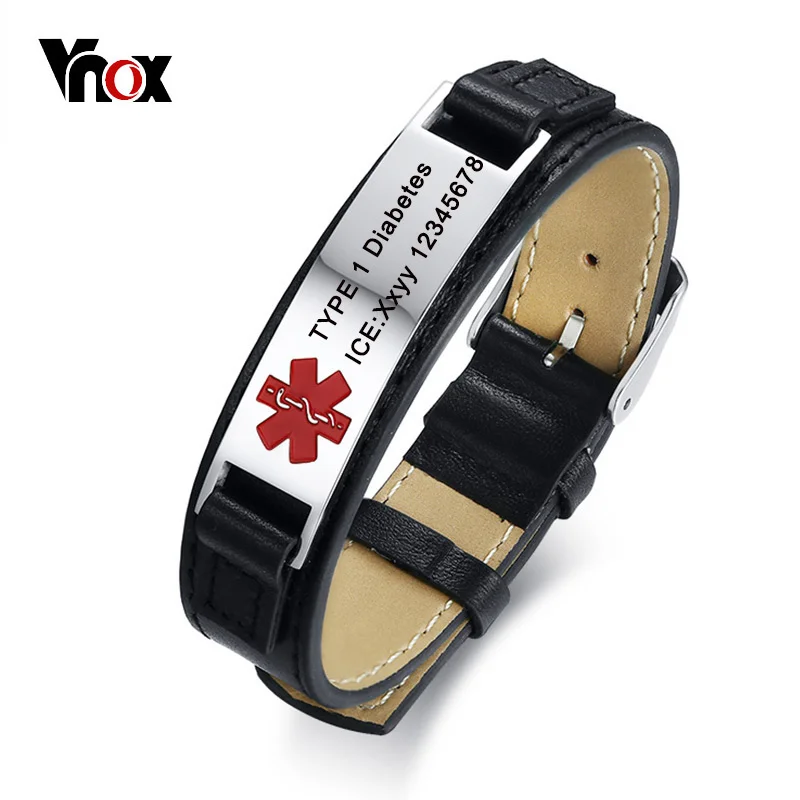 Кожаный браслет Vnox с бесплатной гравировкой, мужские ювелирные изделия с оповещением о болезни диабета и льда