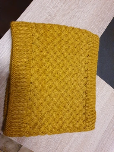 хороший снуд приятного горчичного цвета, тянется. доставка быстрая