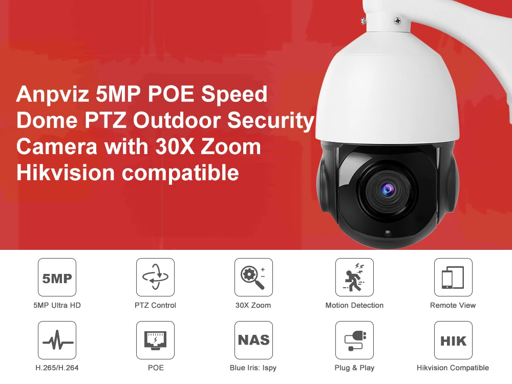 Купольная камера видеонаблюдения Hikvision Anpviz, 5 МП, POE, IP, PTZ, 30-кратный зум, ИК, 80 м, IP66, P2P вид