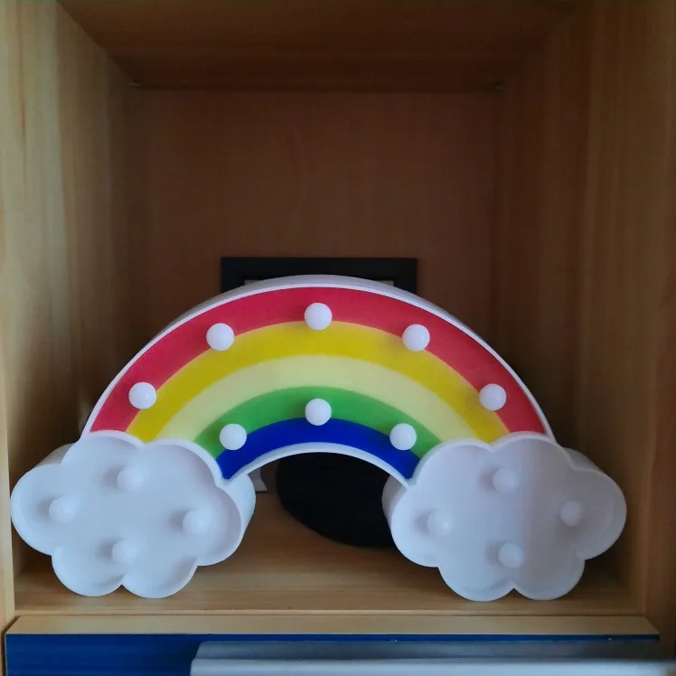 Радуга моей трёхлетней дочке очень понравилась. Засыпает с ней в обнимку. Например, для меня она очень яркая, я с трудом засыпаю под таким ярким светом. Радуга по размеру 30 см в длину, в высоту 16 см и толщину - 3 см. Работает радуга от двух пальчиковых батареек. В комплекте не идут. В Москву радуга пришла ровно за месяц.