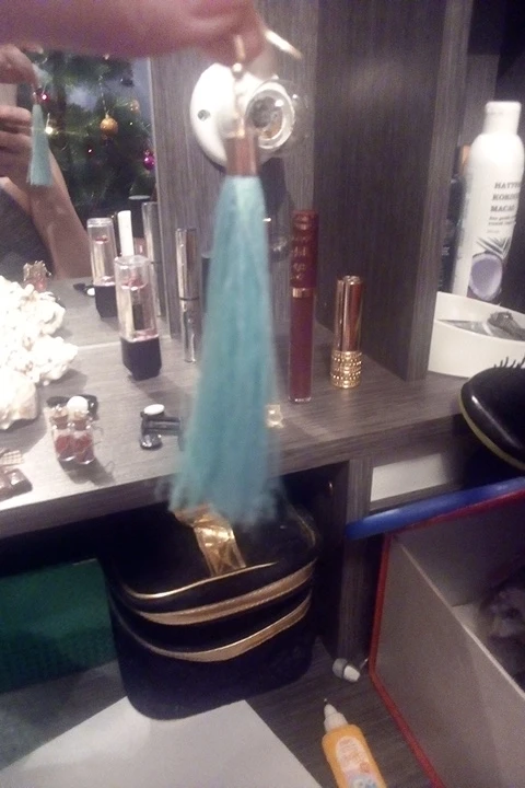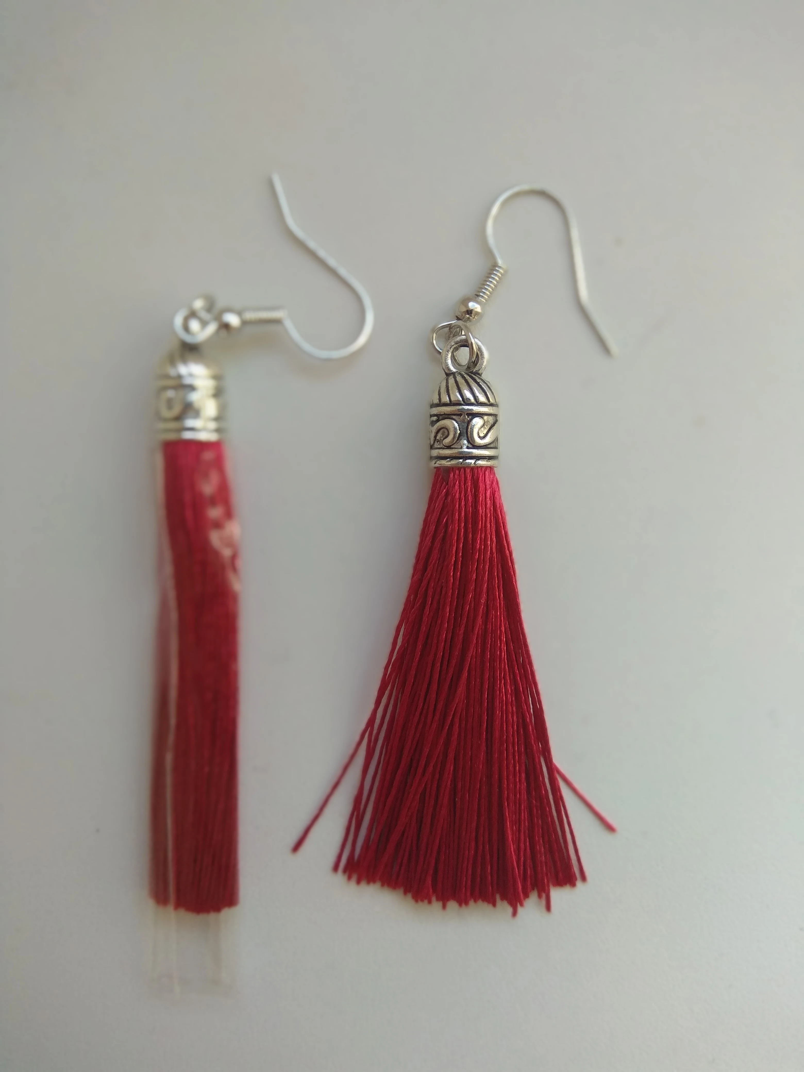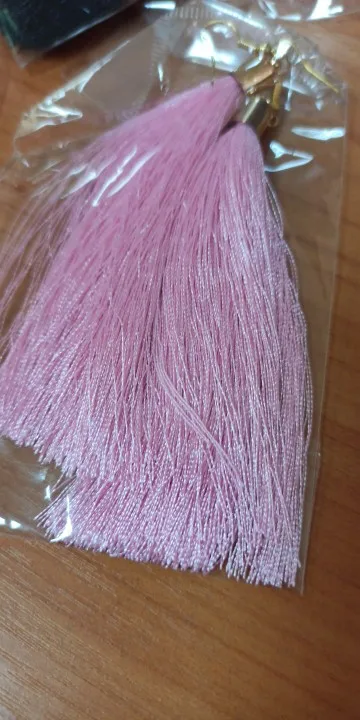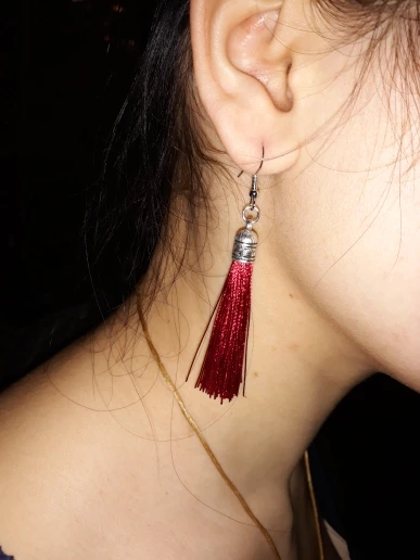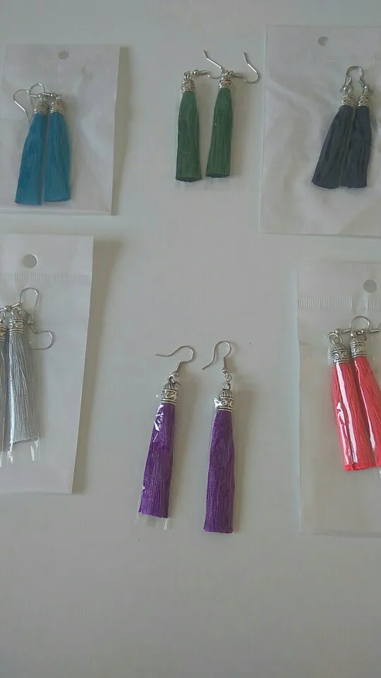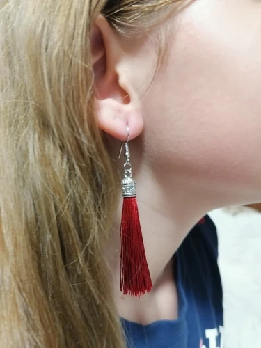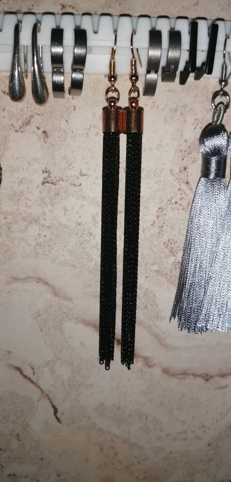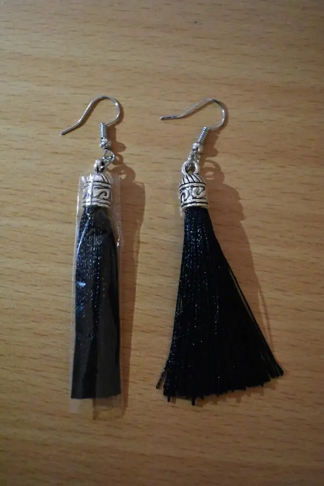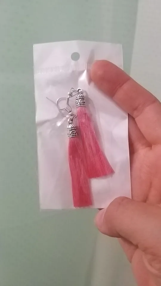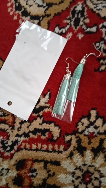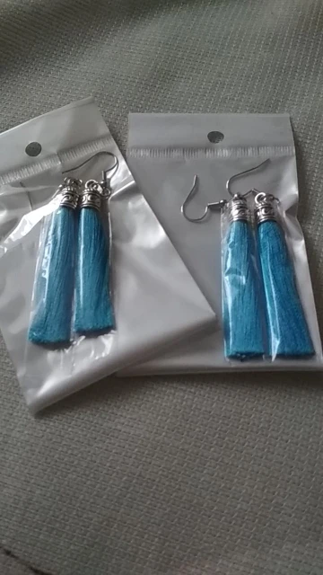 Как не странно, эти серьги, за 25 руб выглядят более празднично из-за длины (длина примерно 10 см). У этого же продавца купила серьги другого цвета (фиолетовые и зелёные) по цене 45 руб, но они гораздо меньше (примерно 5 см).