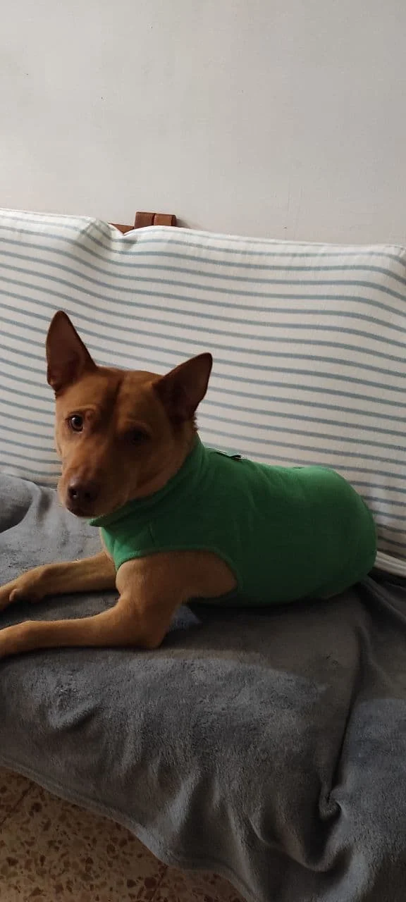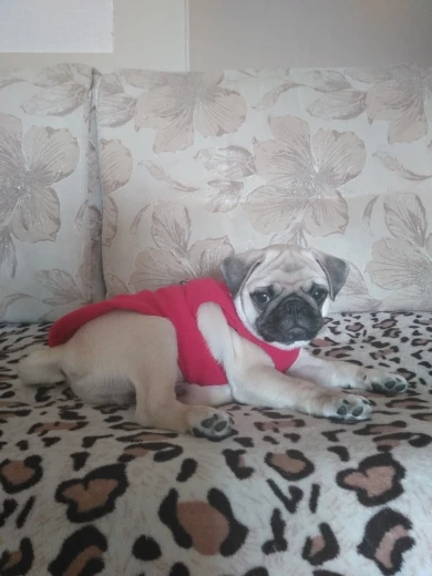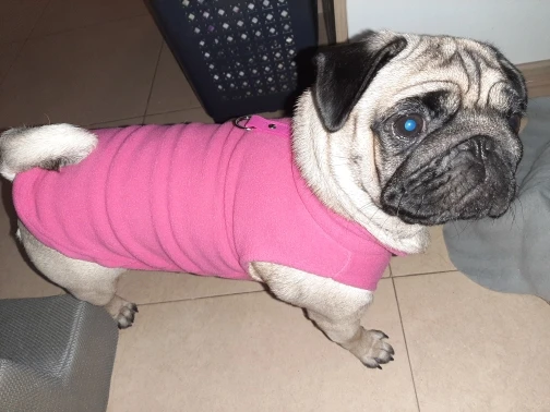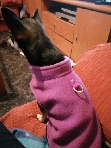 дошла за месяц. по размеру подошла. мягкая, яркая. но крой не вполне удачный - на хлипкого йорка в груди все равно тянет, а проймы наоборот, зияют, слишком широкие, будет ветер задувать.