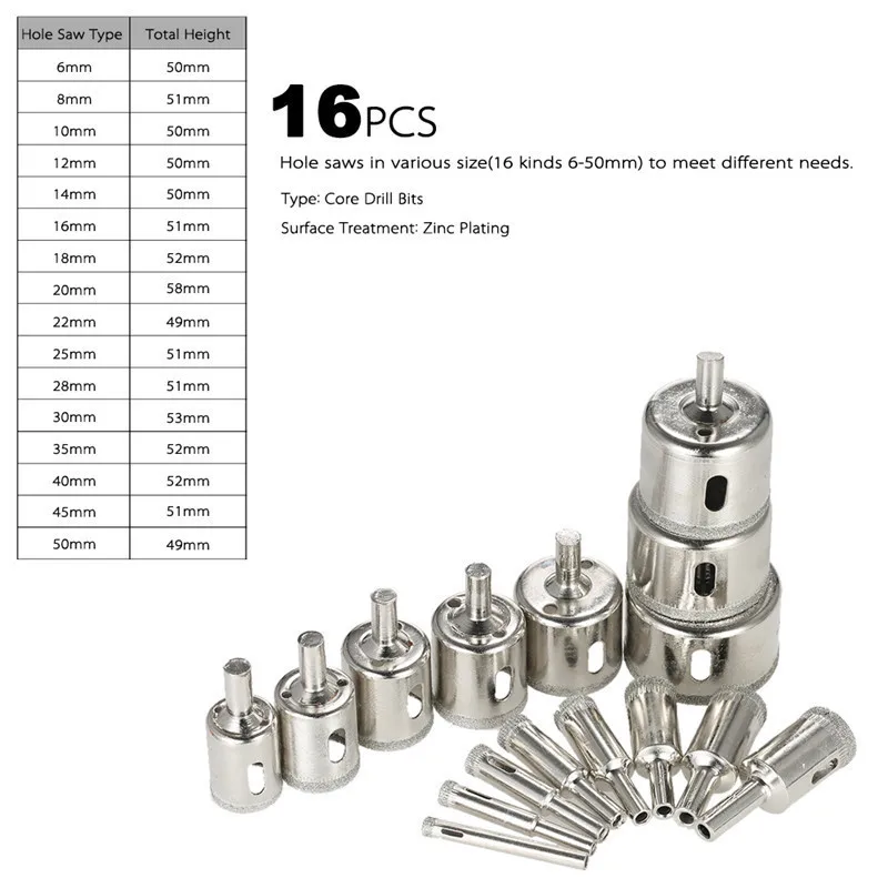 16 шт. 6-50 мм набор алмазных сверл 6-50 мм стеклянная плитка полый экстрактор инструмент для удаления отверстий пила керамика фарфор