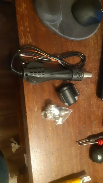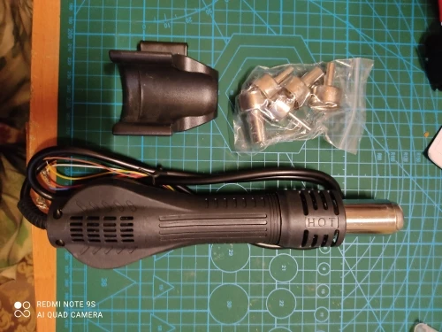 Добротный фен. Пластик без запаха. Литьё почти без облоя. Пластик крепкий, не гнётся. Металлическая трубка и завихритель - нержавейка (магнит не липнет). Сменные наконечники - носики нержавеющие, а основания (которыми крепится к трубке) - обычная сталь. Турбина работает довольно тихо. Сопротивление спирали - 74 Ома. Внутри небольшая плата, которая по сути просто "переходник" с внешнего провода на внутреннюю разводку проводов. Пайка немного не аккуратная. Силовые провода рядом с сигнальными - всё перемешано (по-китайски). Внешний провод довольно мягкий.