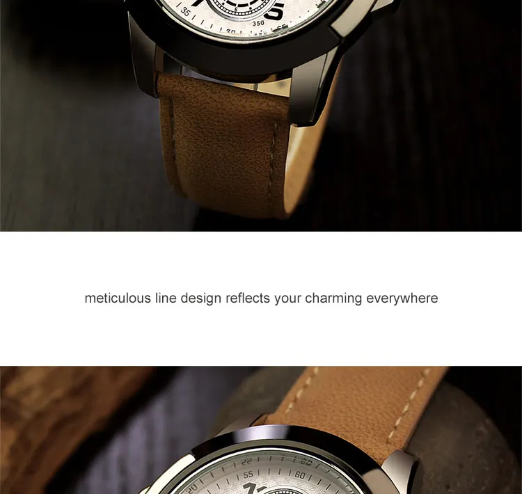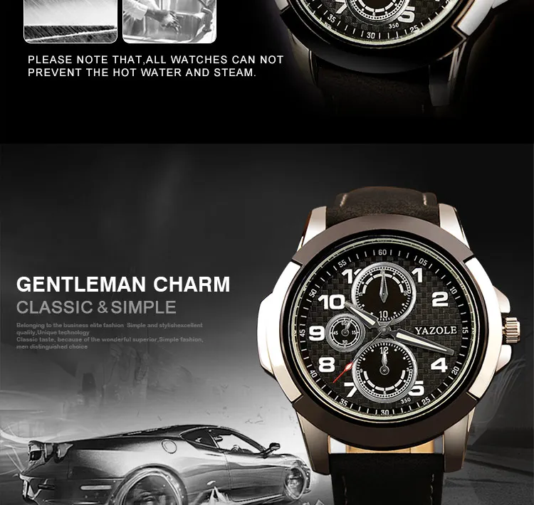 Бренд: YAZOLE Часы категории: Для мужчин Стиль часов: Модный повседневный роскошный бизнес Циферблат Форма циферблата: круглая Тип часового механизма: Кварц Дисплей Тип: указатель Группа Группа материал, кожа Тип застежки: Браслет Цвет ремешка: черный, коричневый Размеры и вес Длина ремешка: 23 см Диаметр циферблата: 5 см Толщина циферблата: 1,2 см Ширина ремешка: 2 см Вес часов: 60 г Водонепроницаемый Описание Возможностью погружения на глубину до 30 м