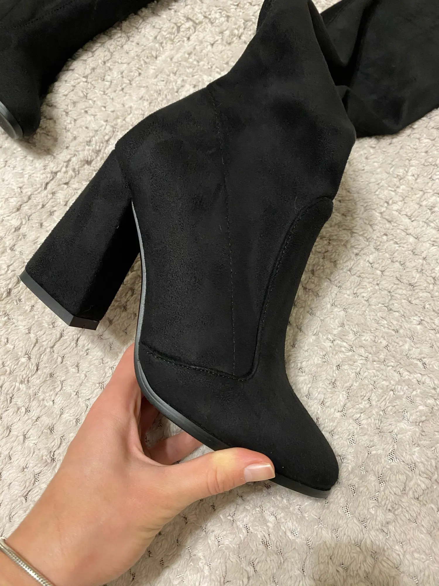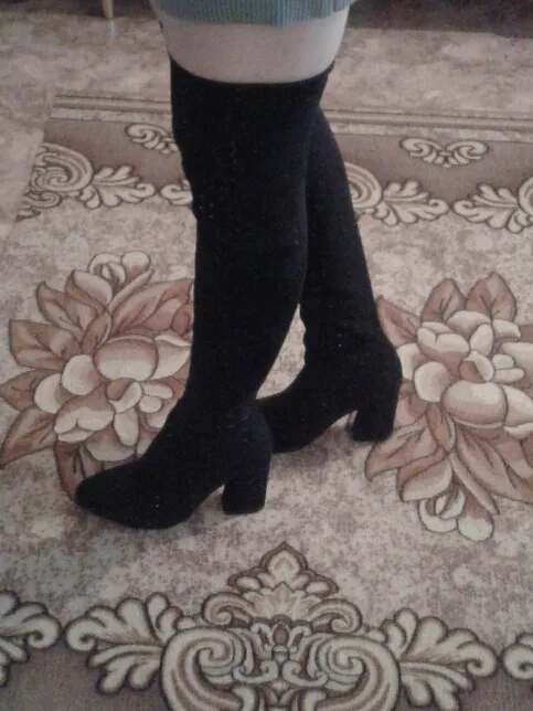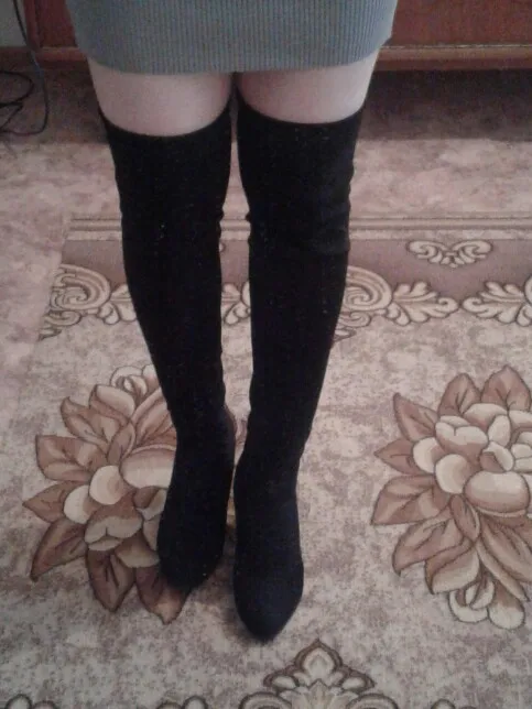 Они божественны! У меня полные бёдра и не тонкая щиколотка, боялась, что не налезут. Отзывы говорят, что в щиколотке не надеть - настолько узко. Продавец обещал, что тянутся хорошо. На самом деле в щиколотке наделись легко, просто на ура! При этом не морщинят, пока не сползают. У меня проблемные ноги, но колодка оооочень удобная, несмотря на высокий каблук. В подъёме не малы, значит, он высокий. Обычно именно в этом месте мне бывает тяжко носить закрытую обувь. Сапоги-чулки были моей мечтой, и эти идеальны! Добавлю позже фоточки, как будет куда надеть.