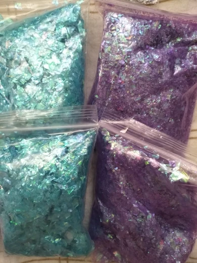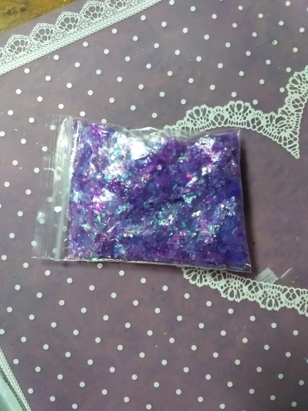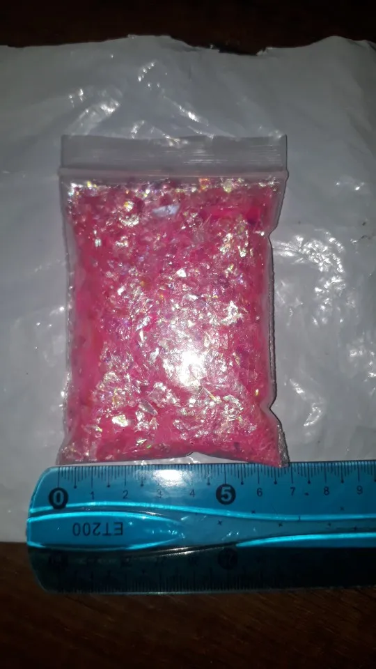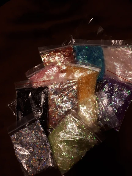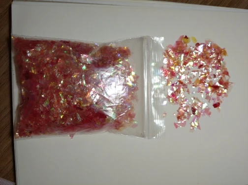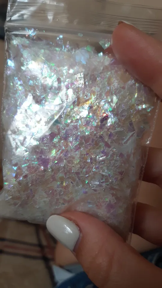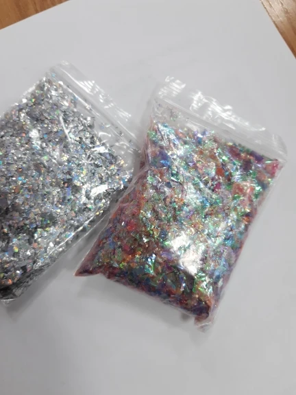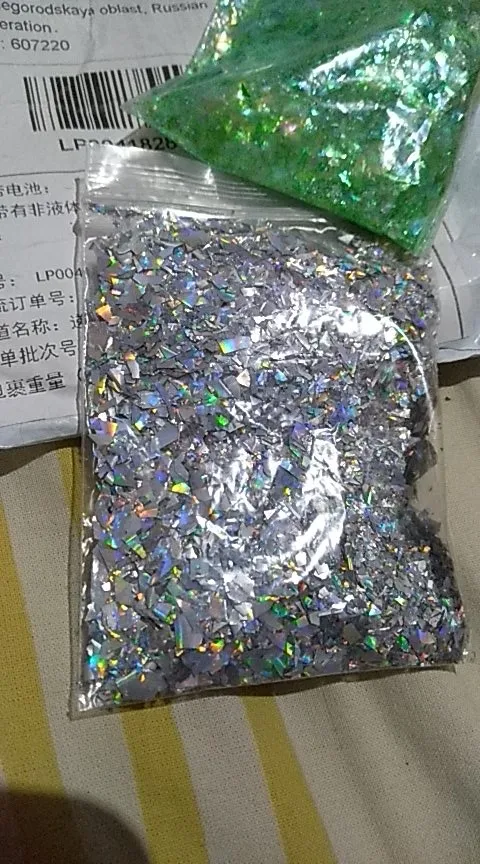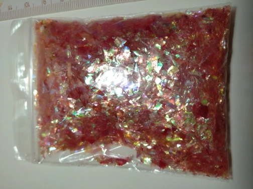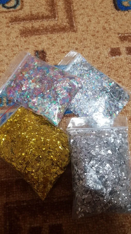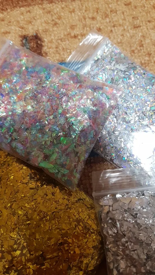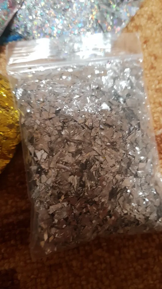Блёстки выглядят не совсем так, как я ожидала, но с описанием совпадает, так что проблема с моей фантазией) Похоже на разрезанный фантик или мишуру. Размер кусочков разный, от сантиметра по одной из сторон до практически пыли. Заказывала для эпоксидки, прикольно) Хочу взять ещё пару цветов (у меня золотой)